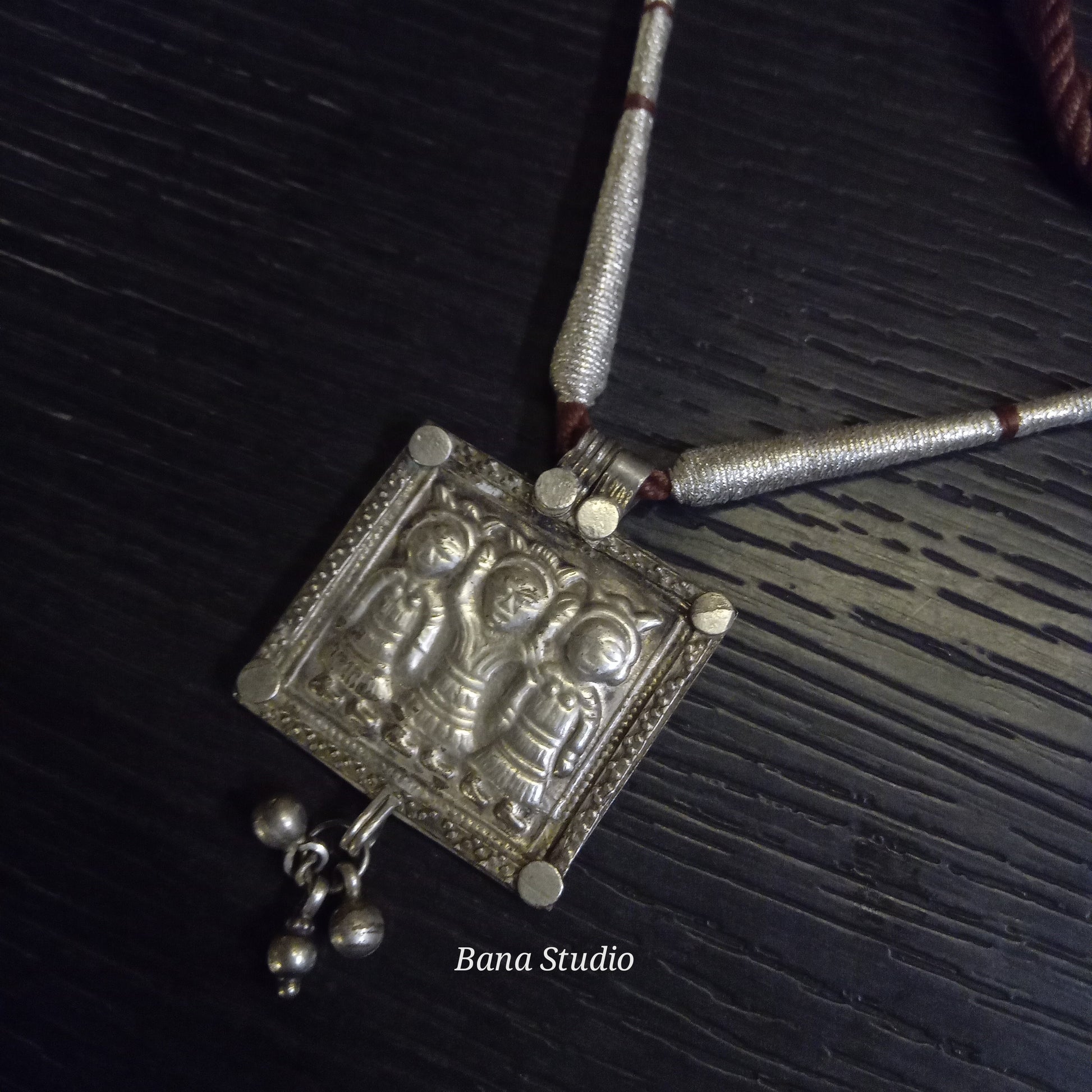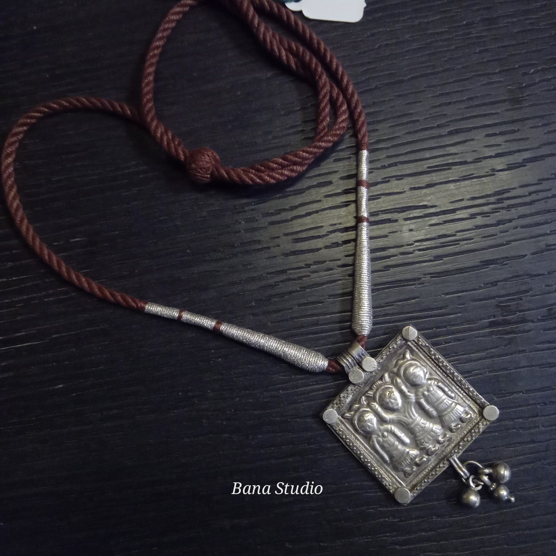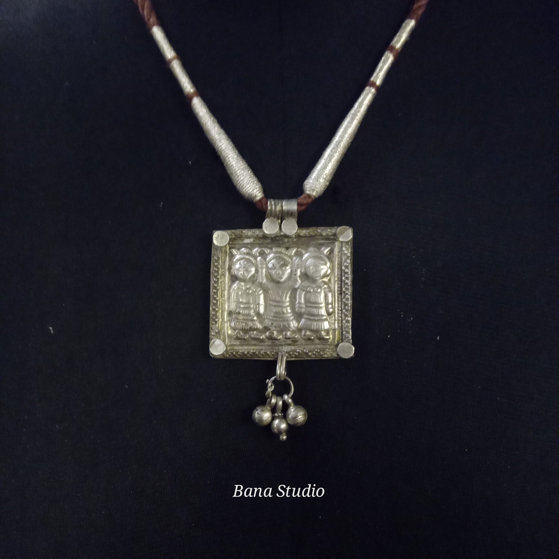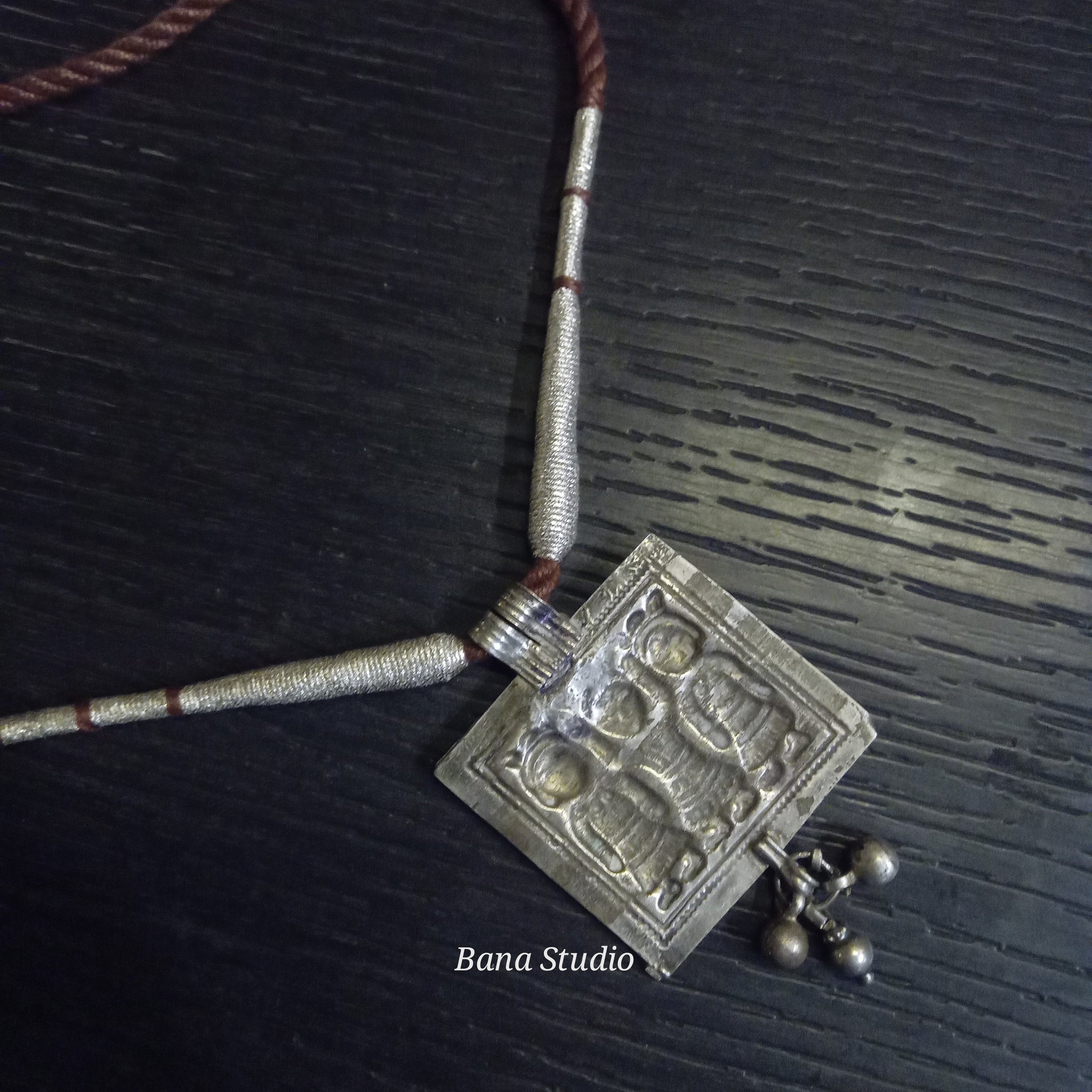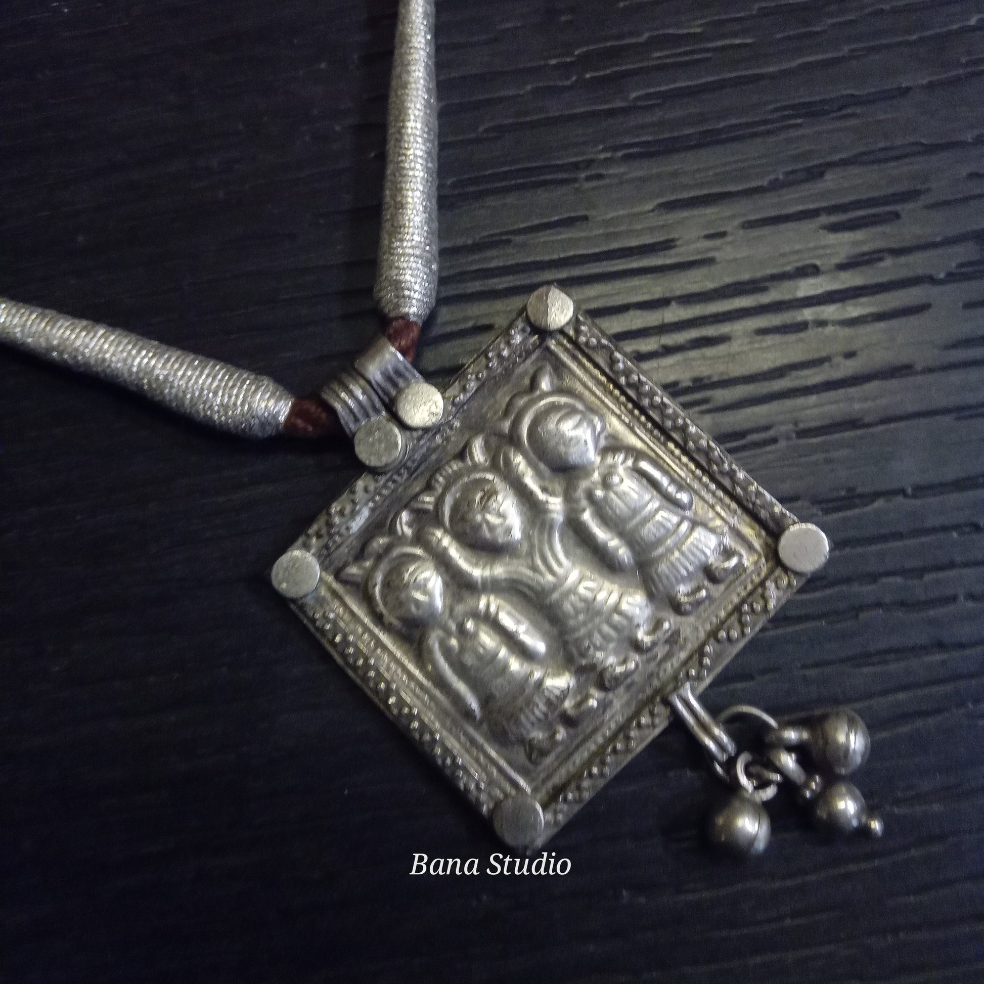 Vintage silver amulet pendant of Ahoi Mata from Himachal Pradesh strung in adjustable cotton thread.