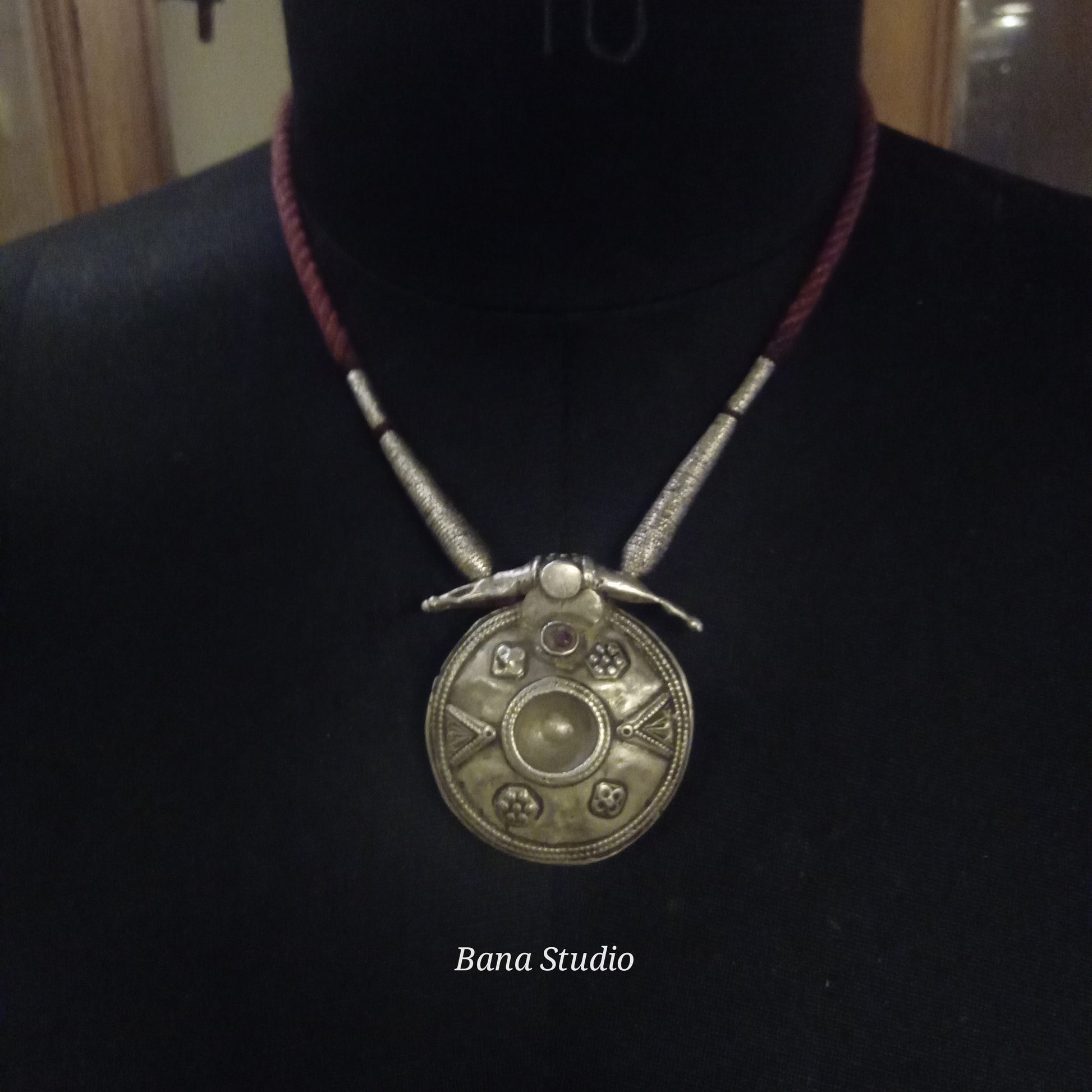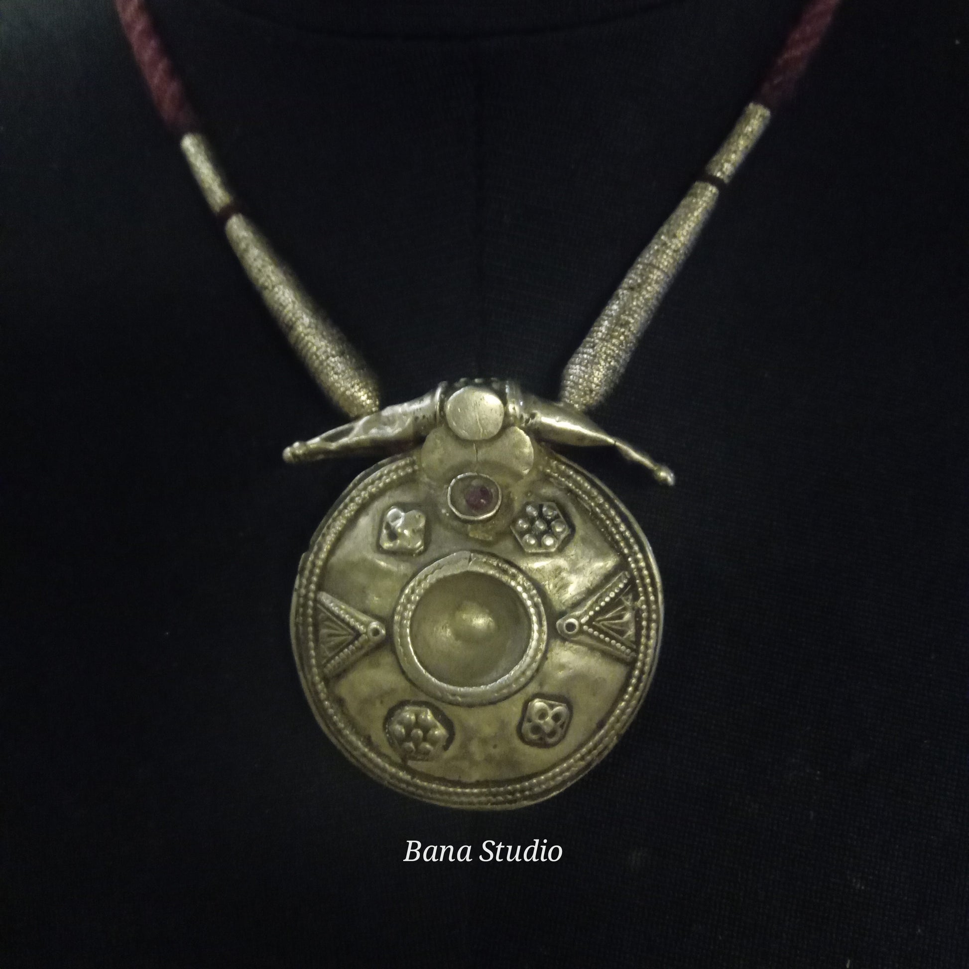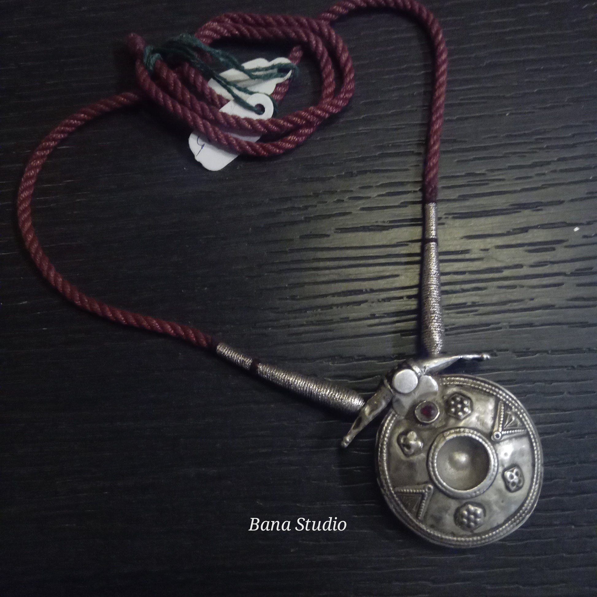 Rare vintage silver earring converted into pendant from Gujarat strung in adjustable cotton thread.