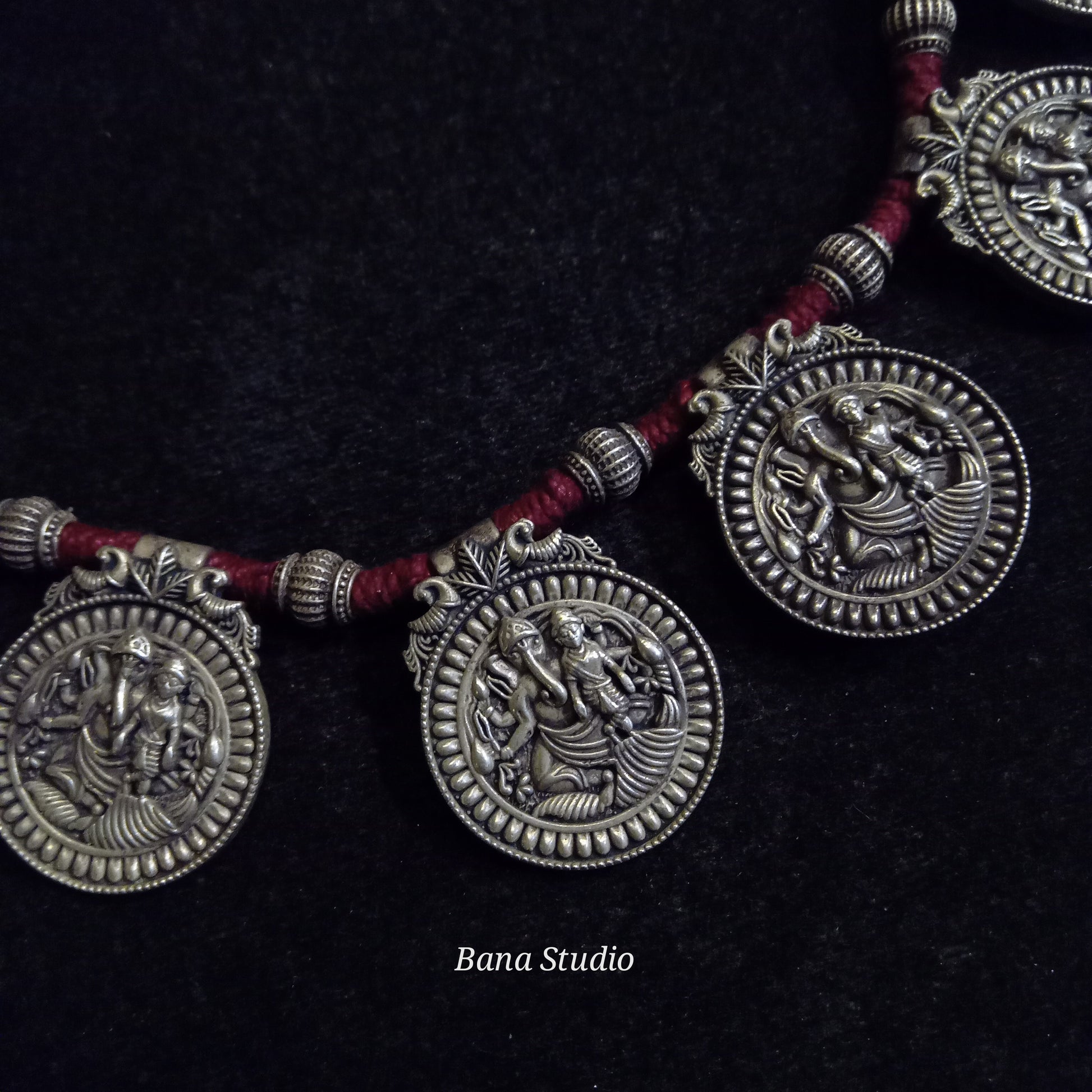 Lakshmi Ganesh vintage silver necklace strung in adjustable cotton thread.