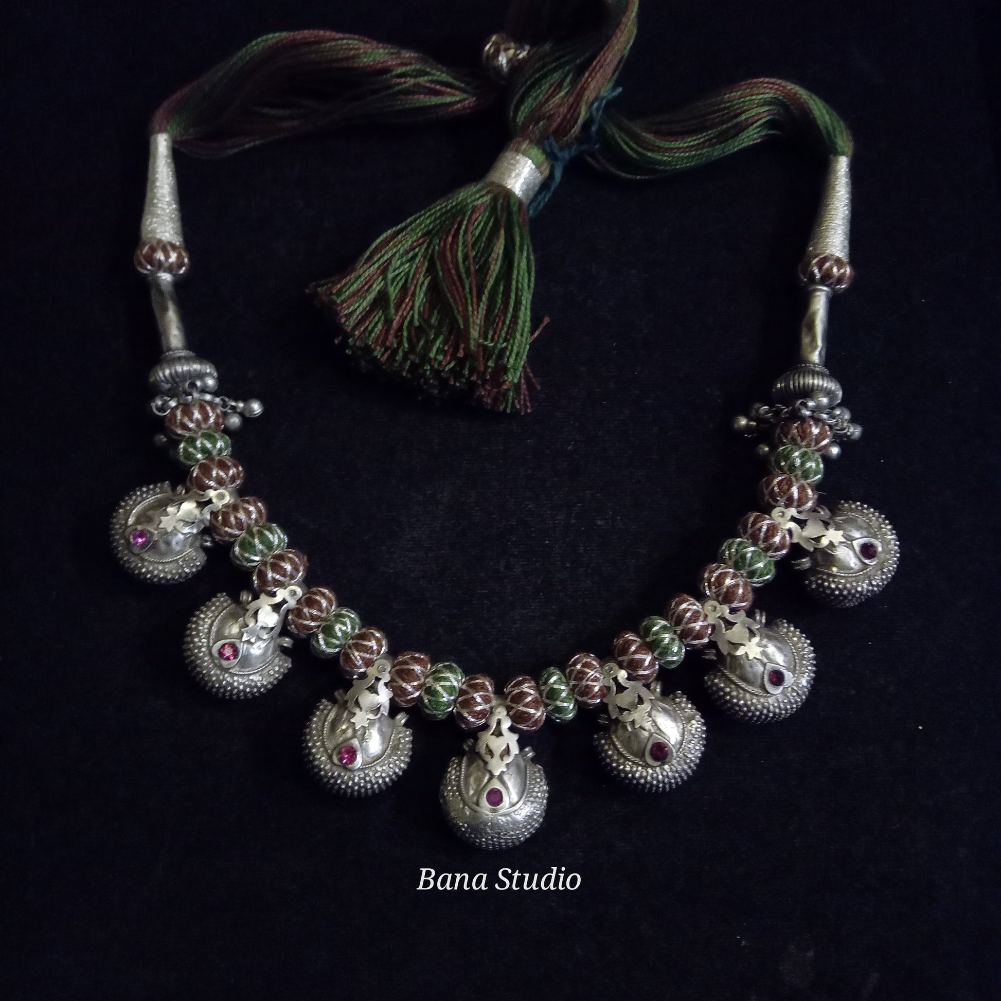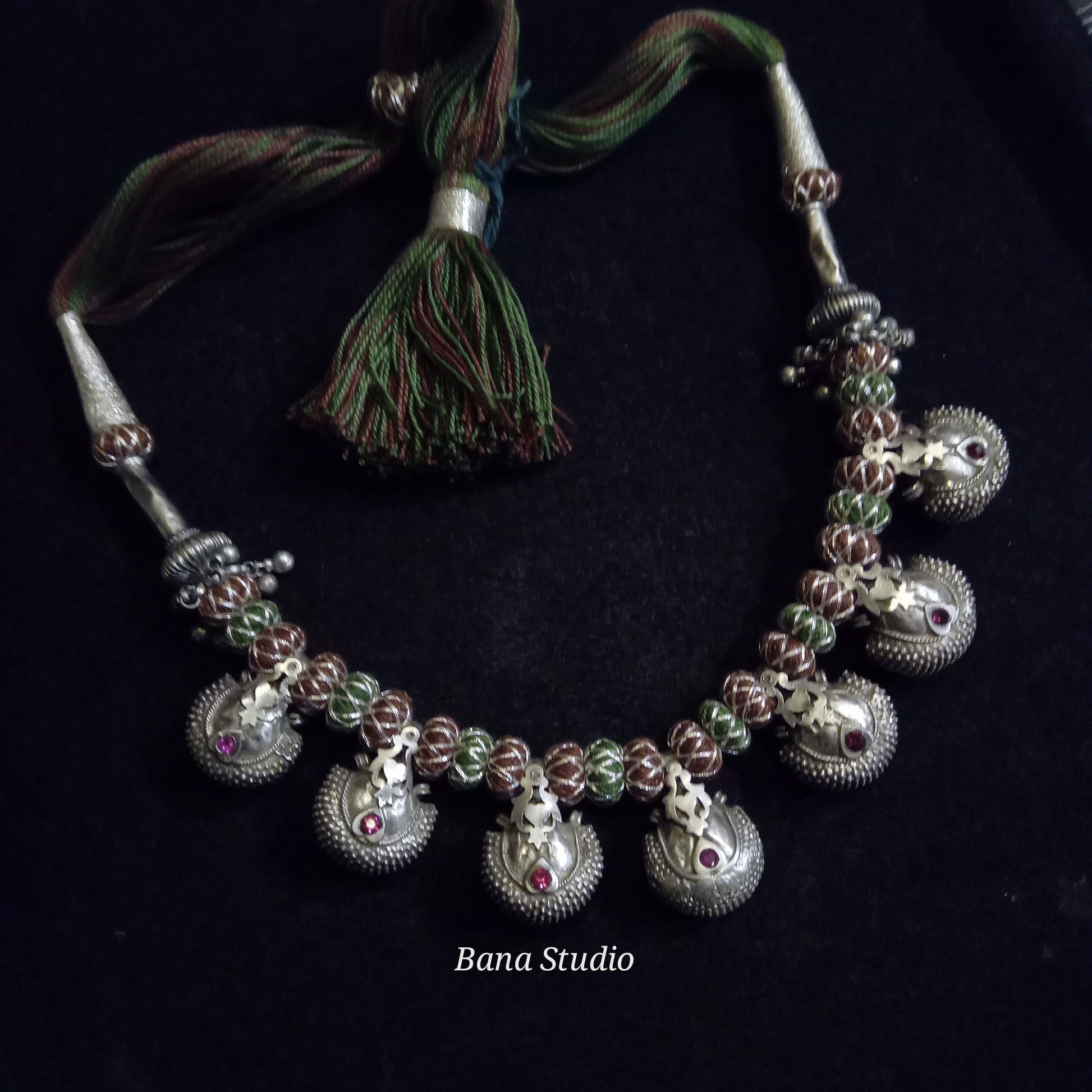 Made vintage silver necklace from Rajasthan studded with glass and strung in adjustable cotton thread.