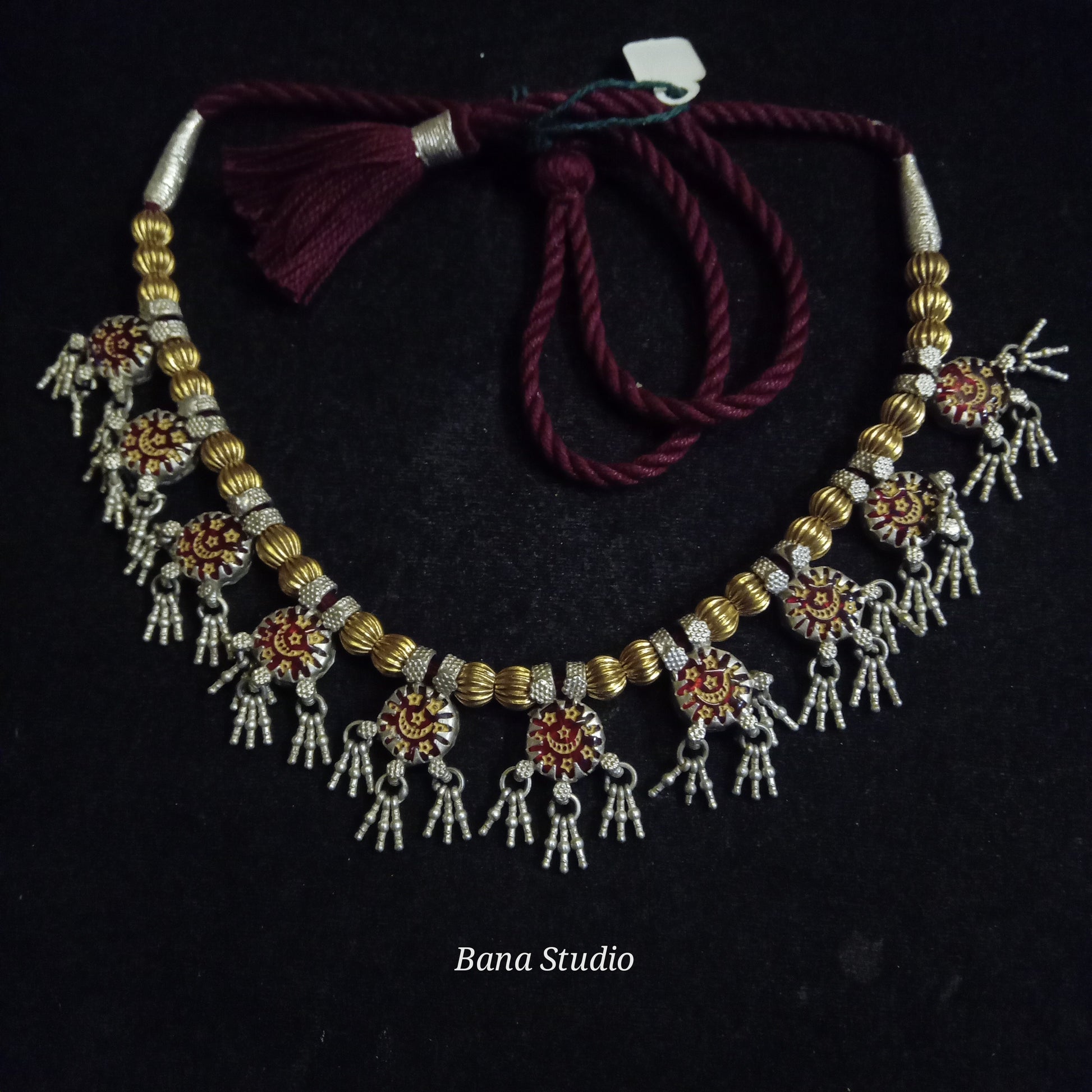 Vintage dual tone silver necklace from Rajasthan studded with glass and strung in adjustable cotton thread.