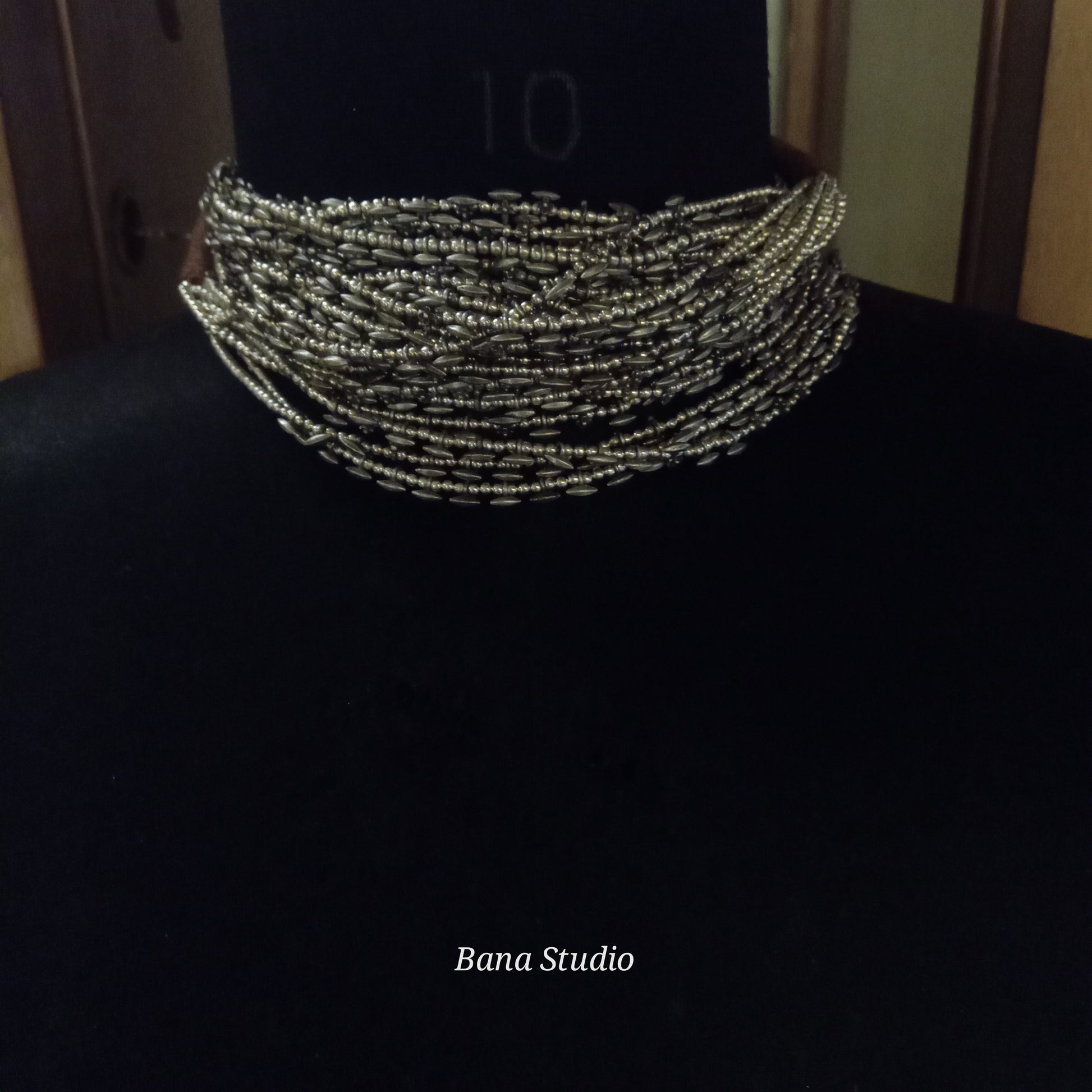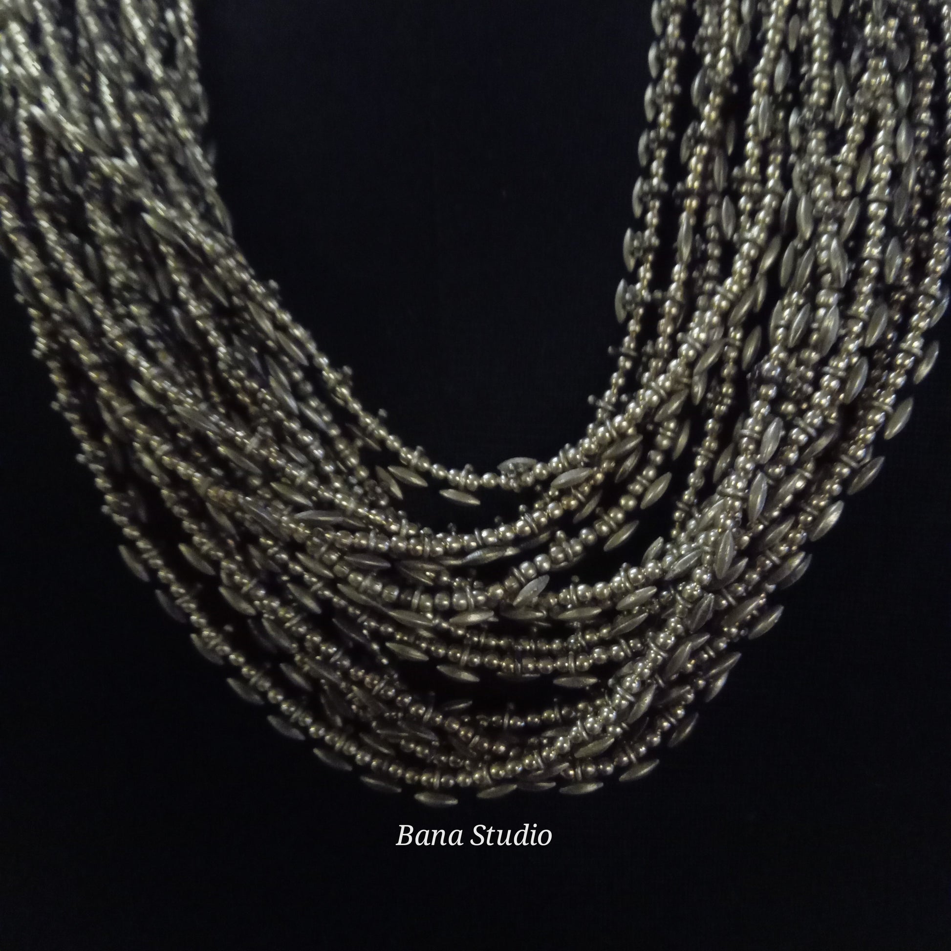 Vintage silver necklace from Odhisa called "Dhaan Sorisa Mala" comprising tiny beads in the shape of rice and mustard. Length 30 inch.