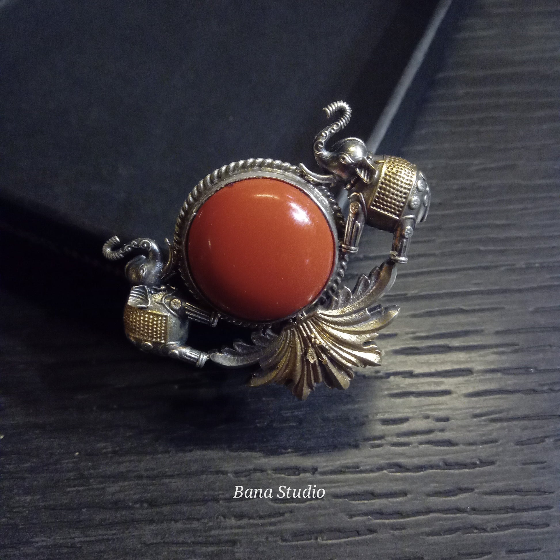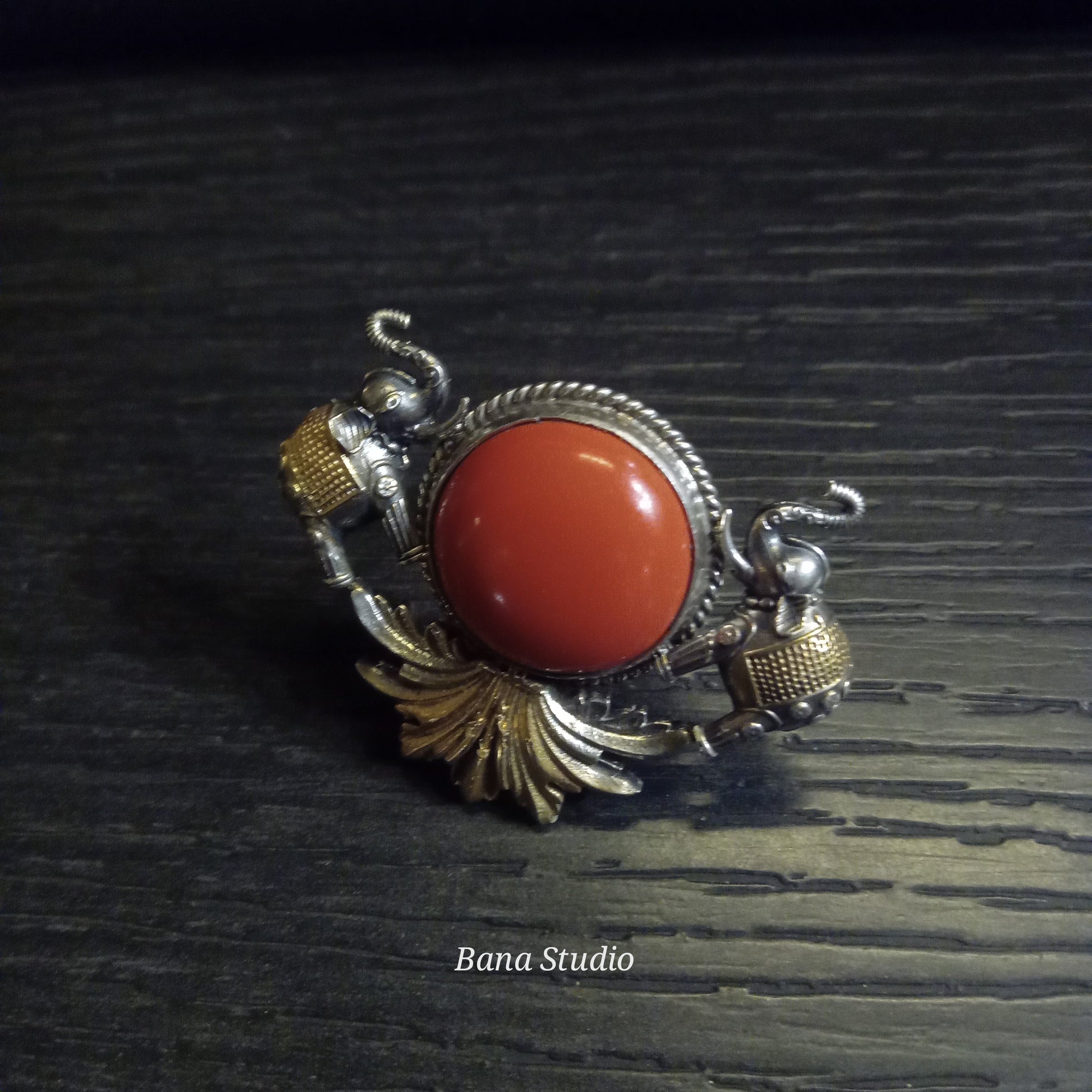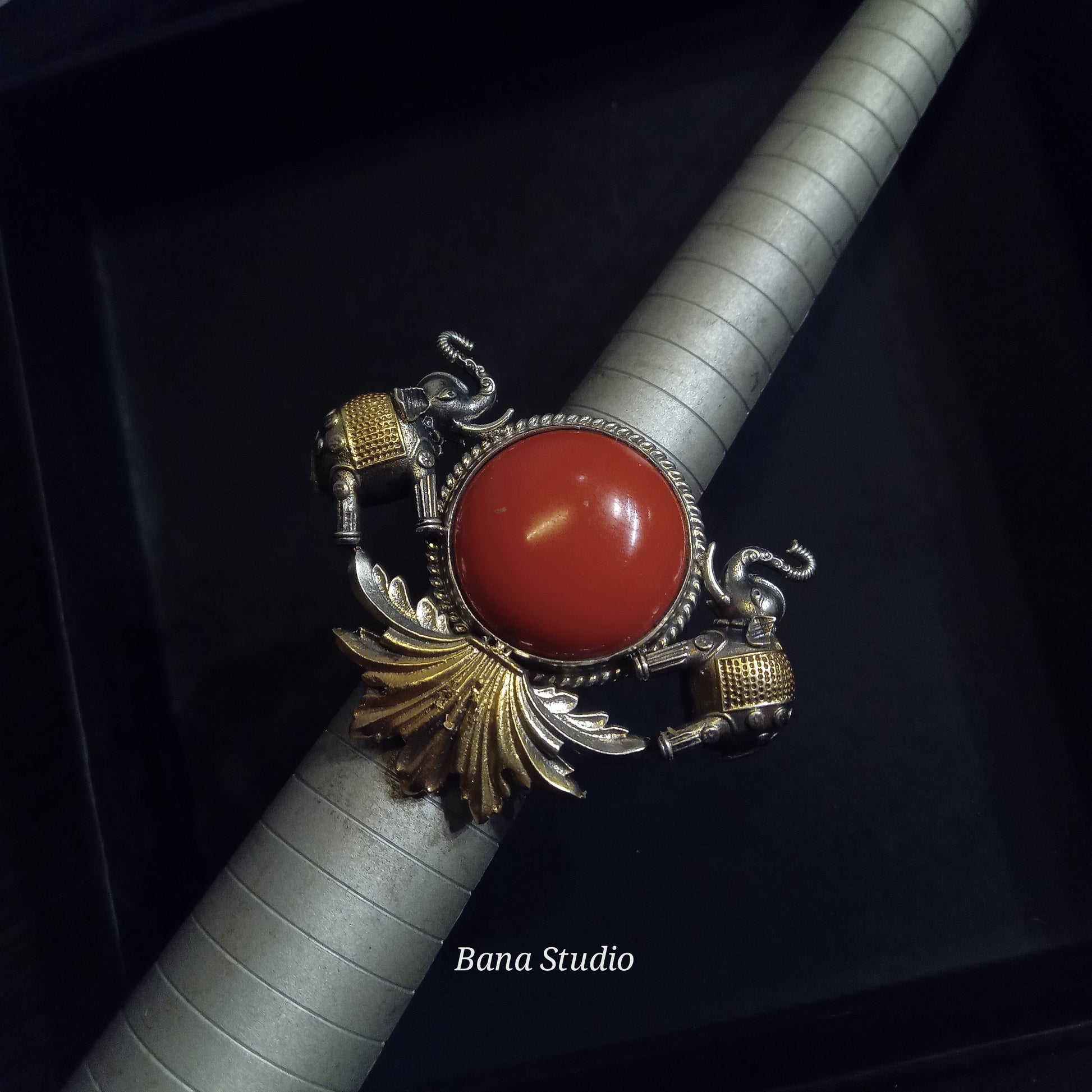 Dual Tone adjustable 925 silver ring studded with reconstituted coral.