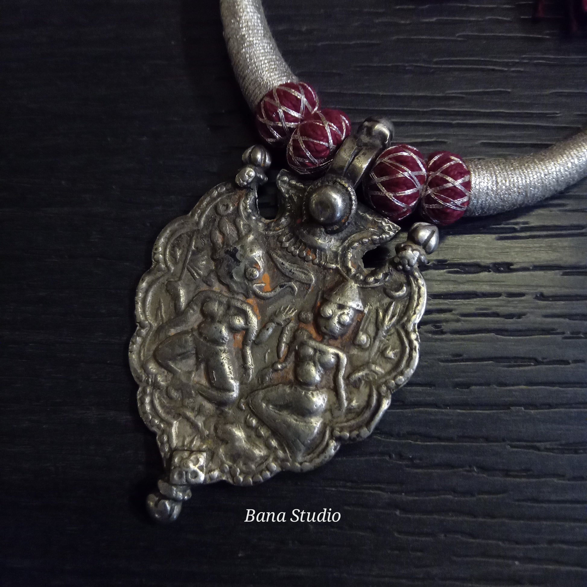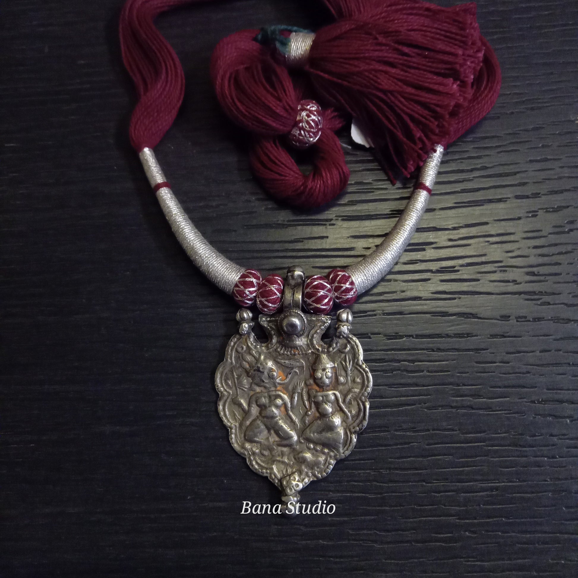 Vintage silver auspicious amulet pendant from Madhya Pradesh strung in adjustable cotton thread.