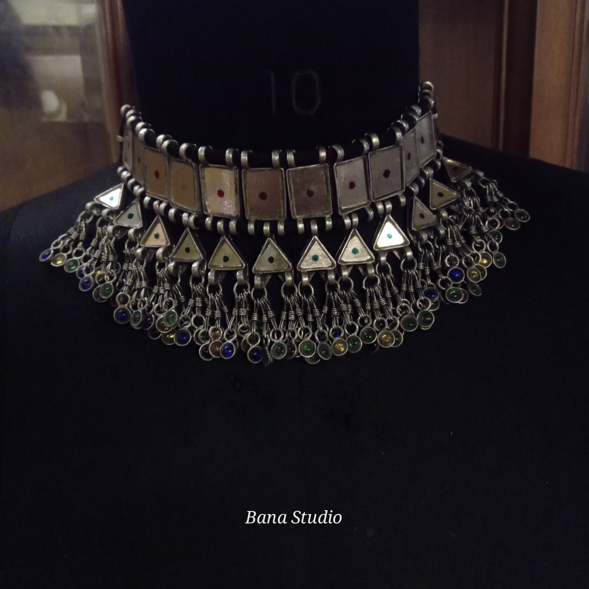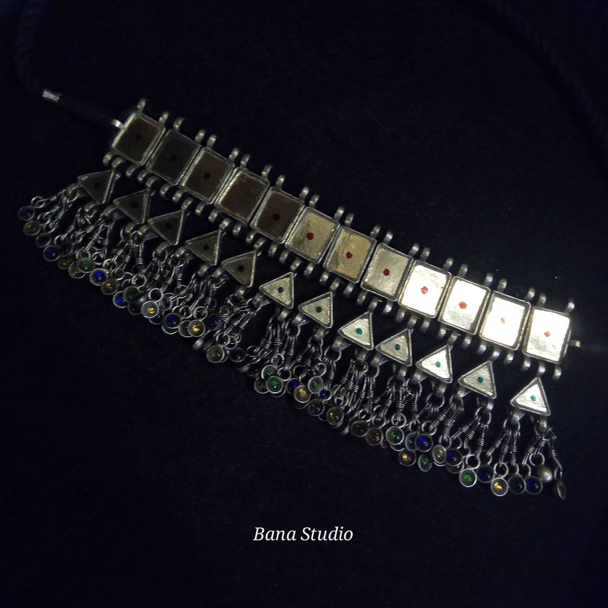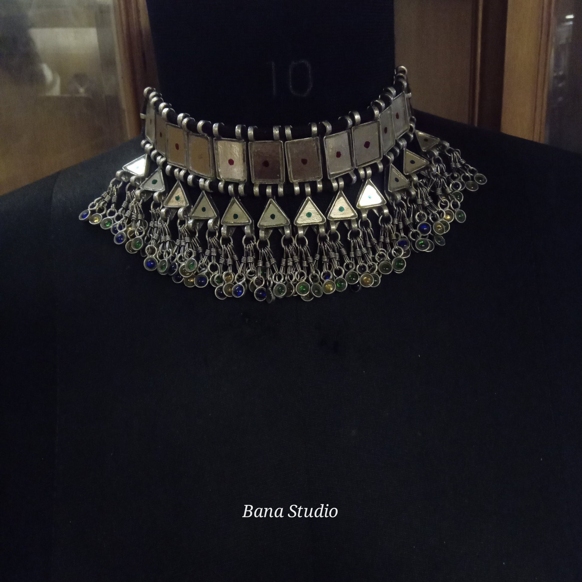 Vintage silver choker necklace from western Uttar Pradesh studded with foiled glass and strung in adjustable cotton thread.