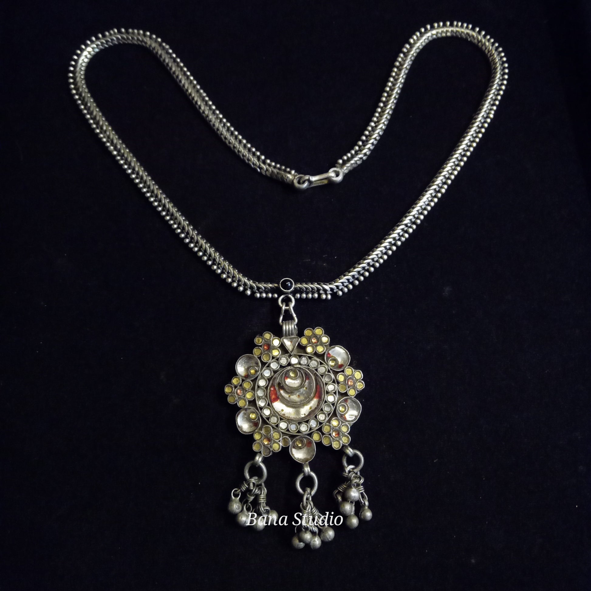 Vintage silver pendant from western Uttar Pradesh studded with foiled glass in silver chain.