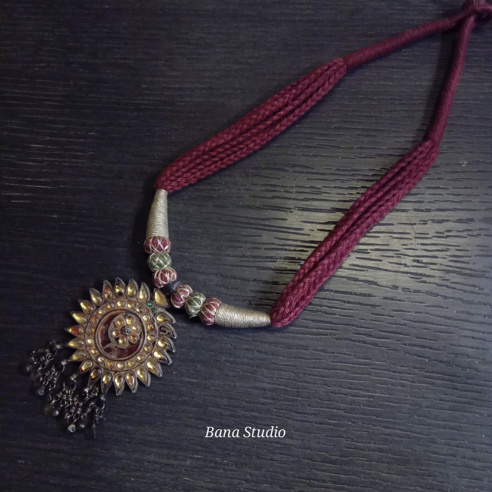 Vintage silver pendant from western Uttar Pradesh studded with foiled glass and strung in cotton thread.