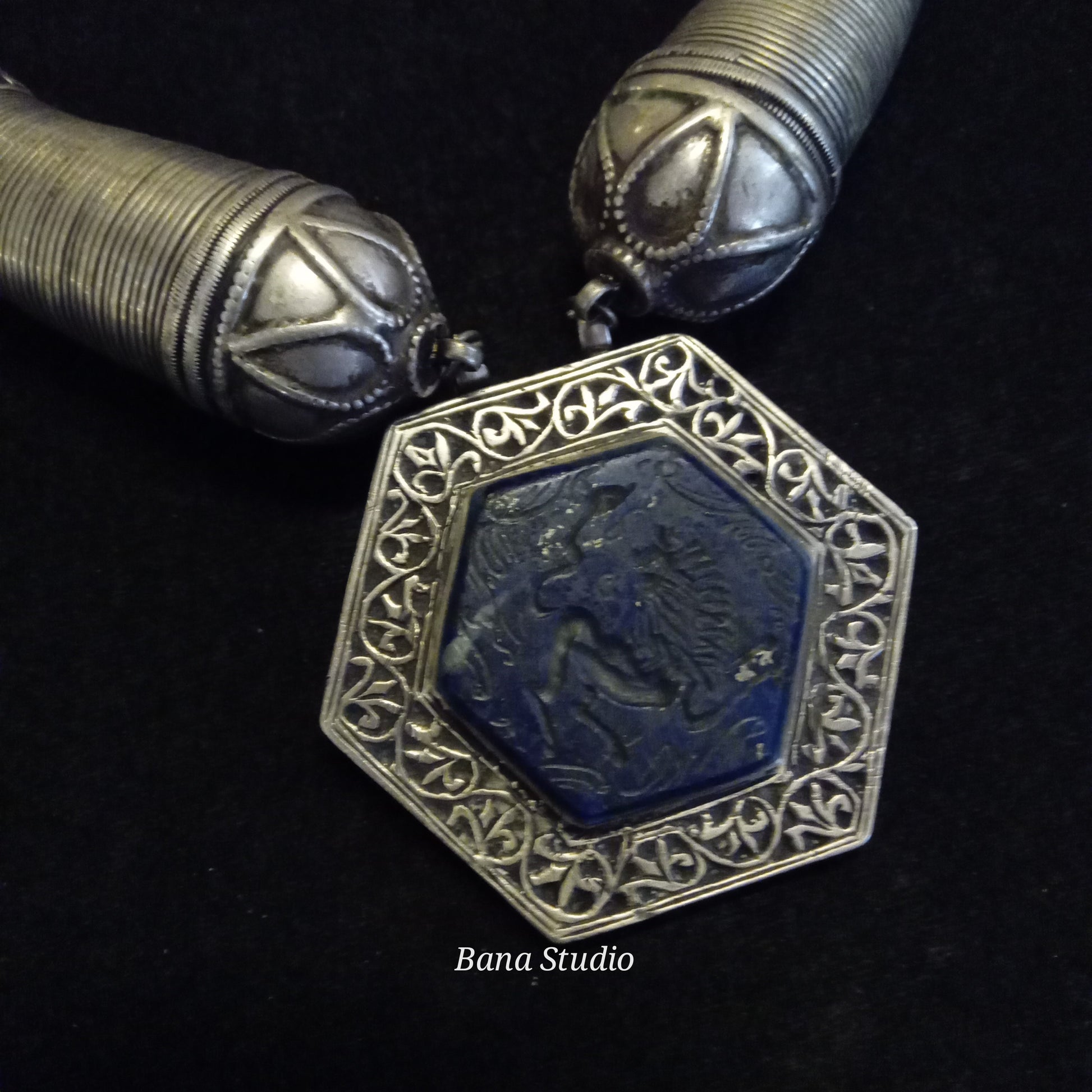 Made up vintage silver Hasli necklace with carved lapis lazuli in the pendant strung in adjustable cotton thread.