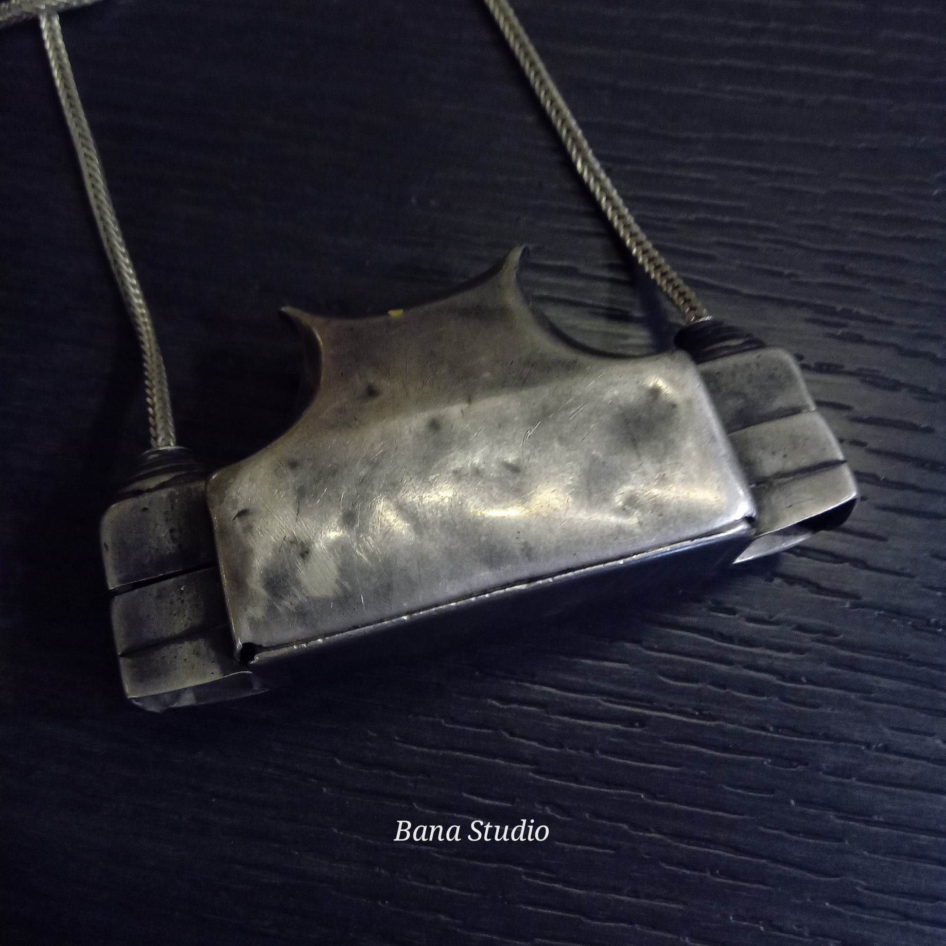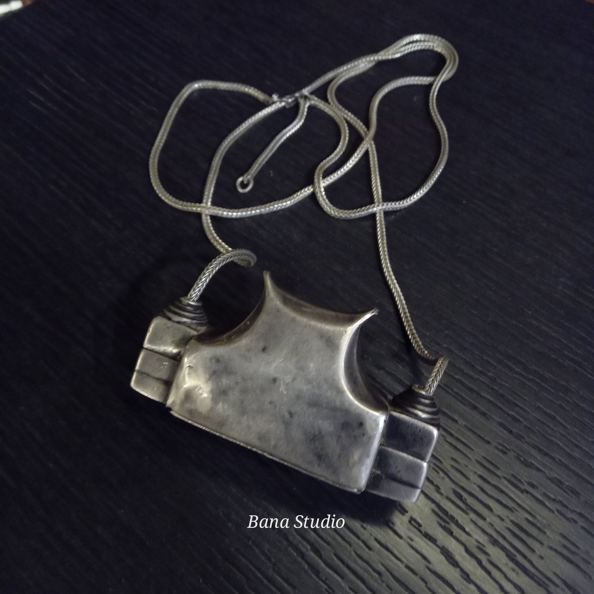 Vintage silver amulet pendant from Karnataka suspended on silver chain. Drop 20 inch