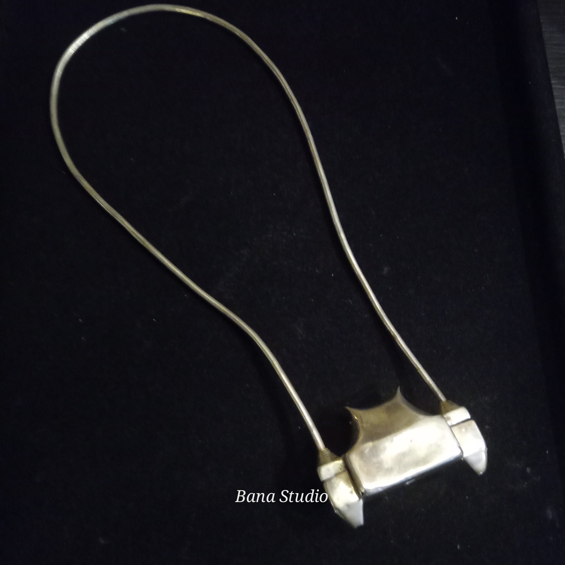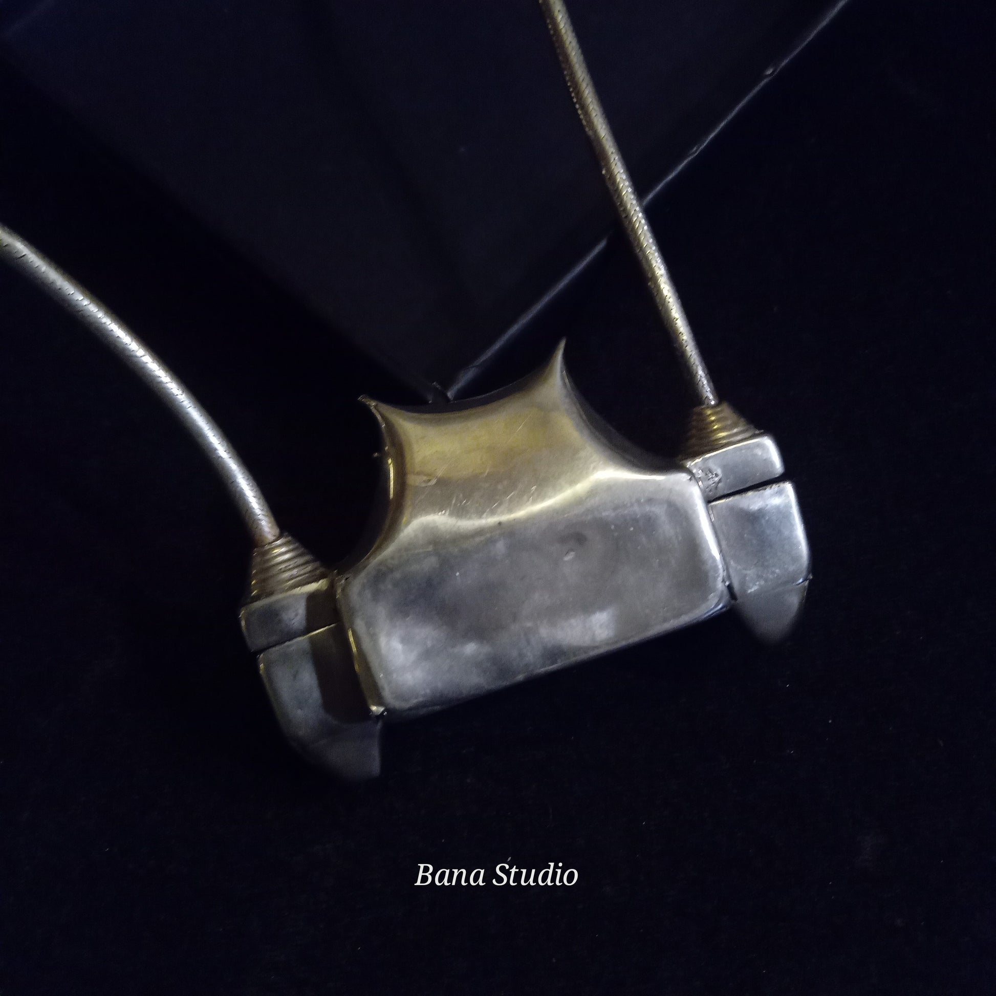 Vintage silver Lingam casket of Shavites Basava Lingayats in square form from Karnataka. The projection symbolizes stylised Bull horn, reference to Nandi. Pendant height 4cm, width 7cm and depth 2.3cm. Fall 12 inch.