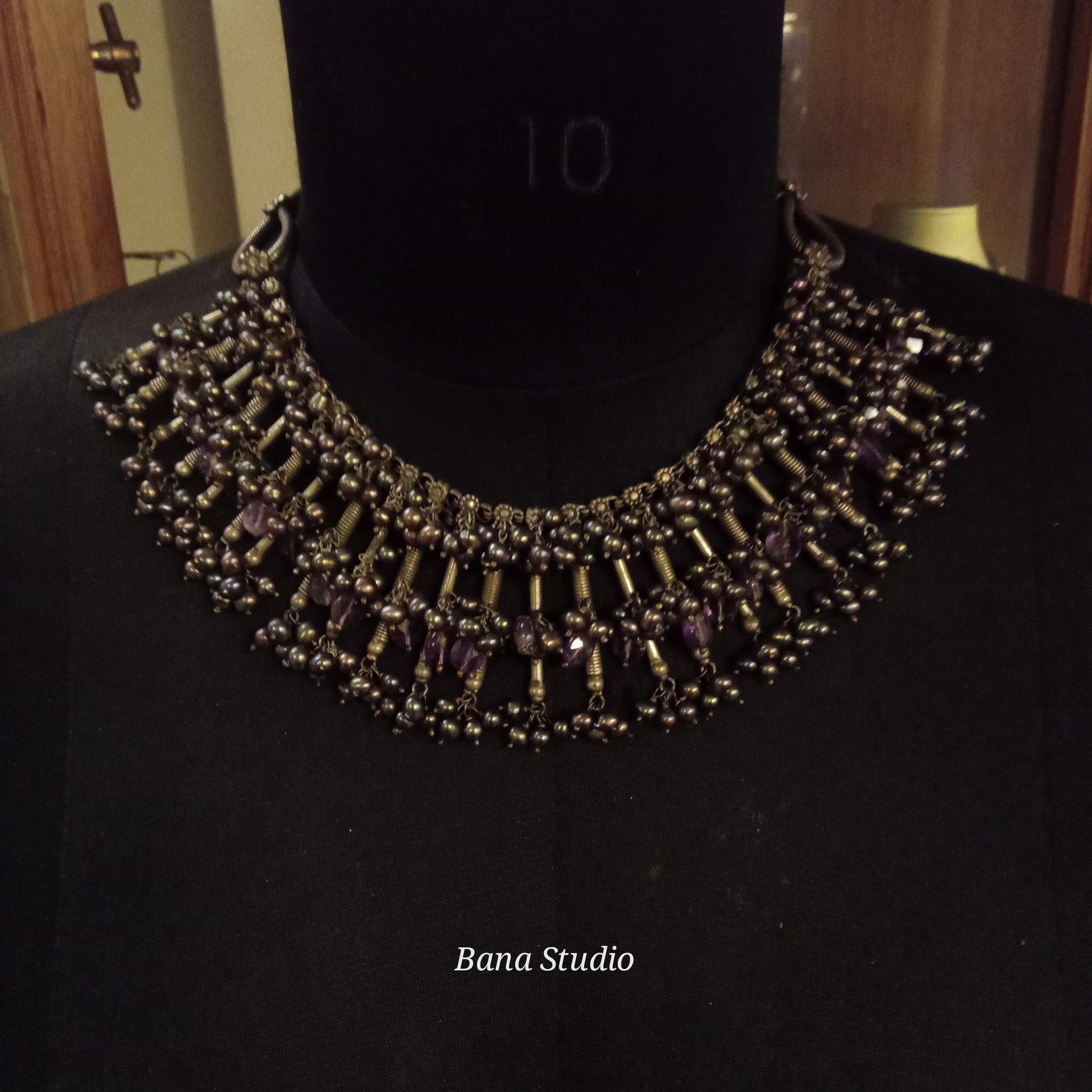 Made up silver necklace with black pearls and Amethyst strung in adjustable cotton thread.