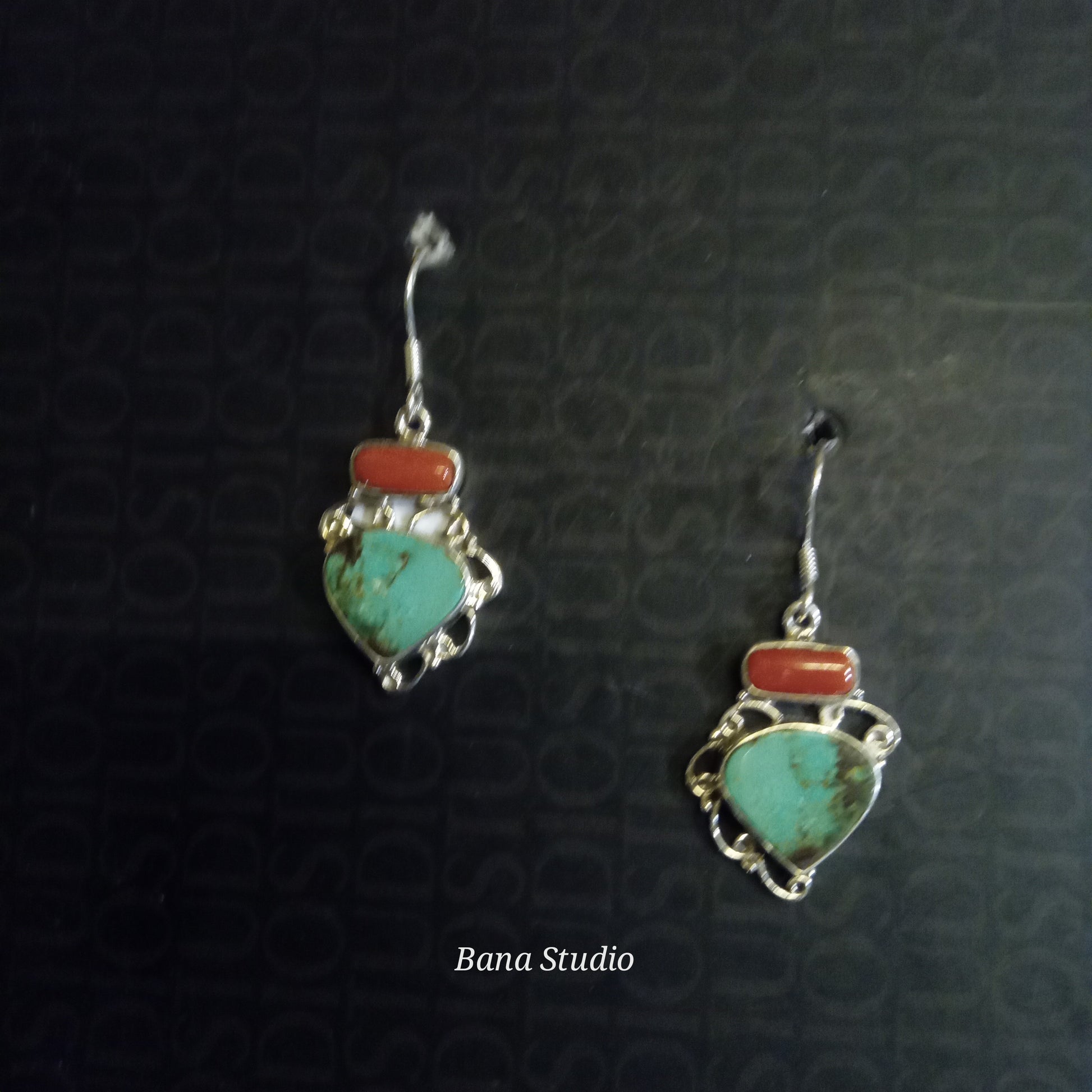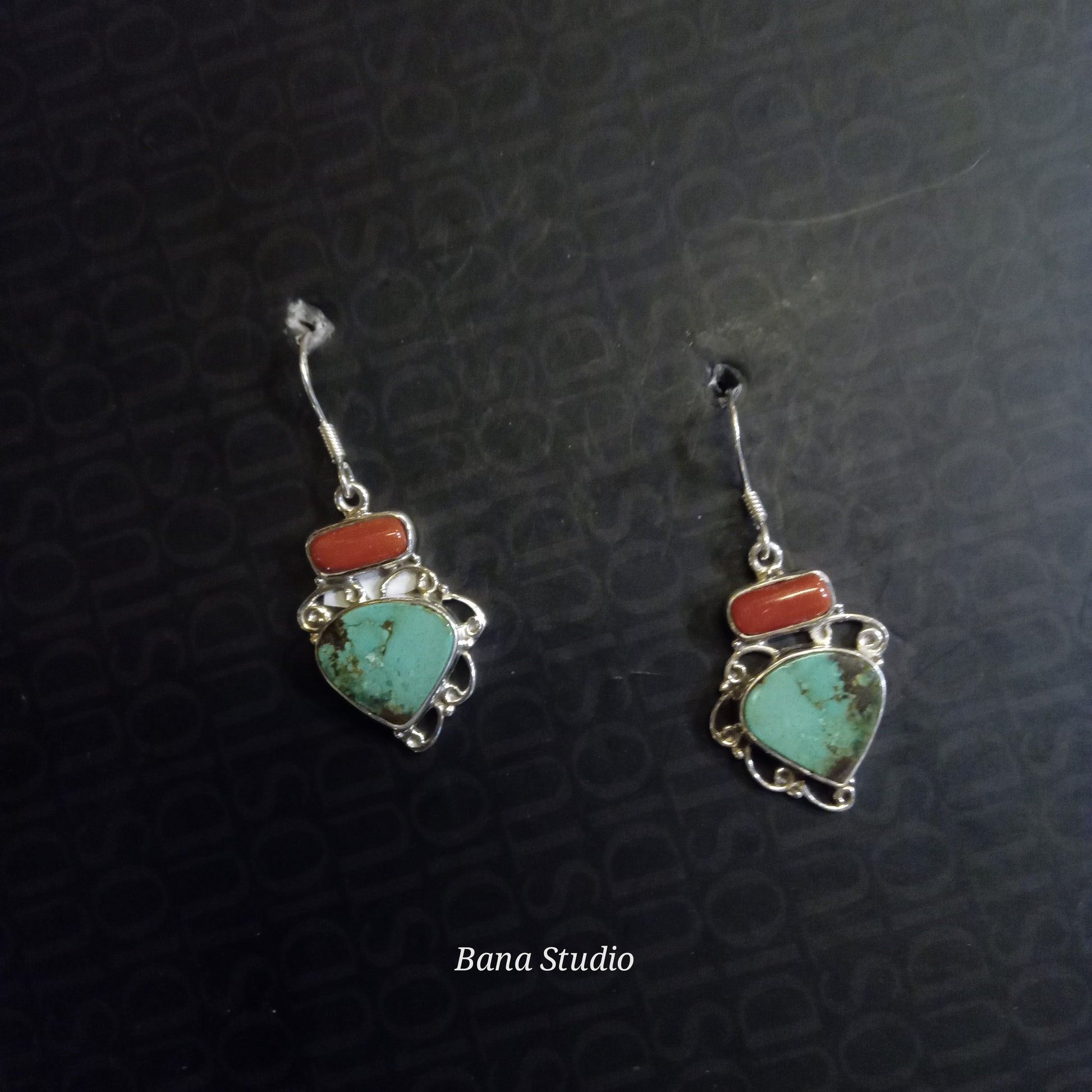 925 silver earrings studded with real natural corals and turquoise. Length 4cm