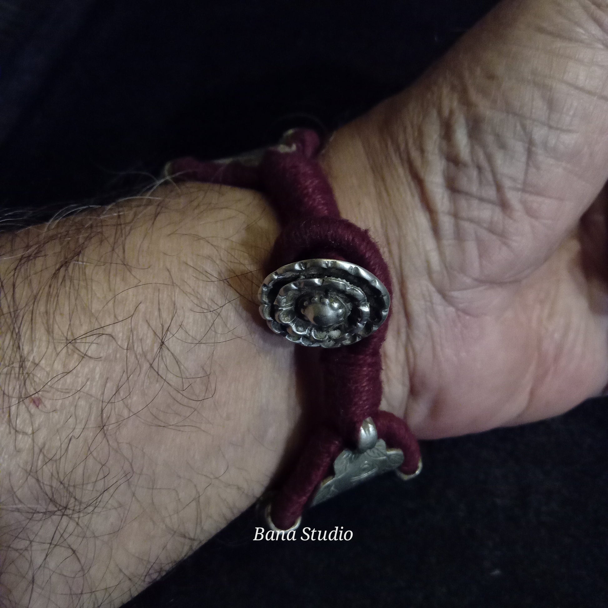 Rare and beautiful vintage silver bracelet from Odhisa strung in cotton thread.