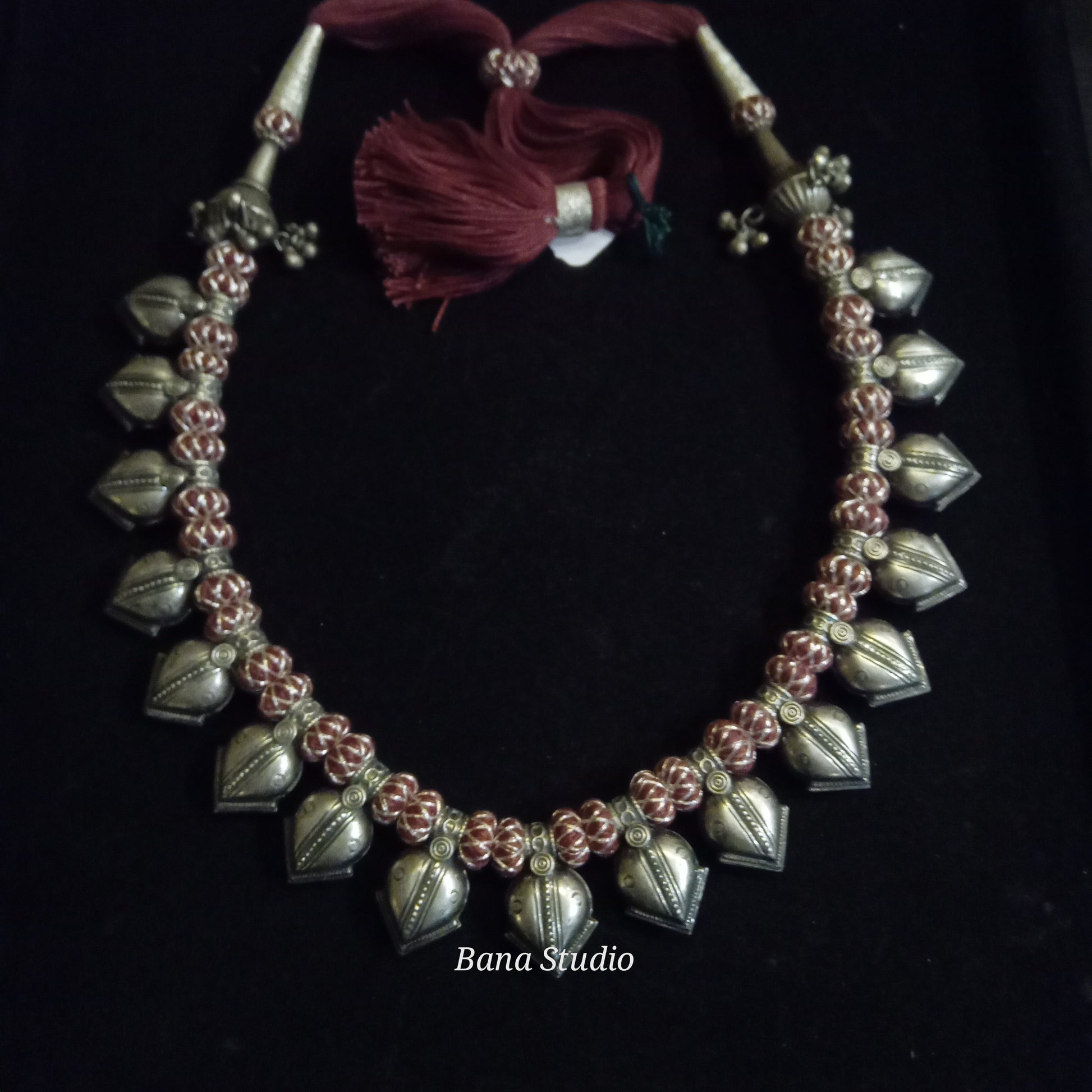 Vintage silver necklace from Rajasthan strung in adjustable cotton thread.