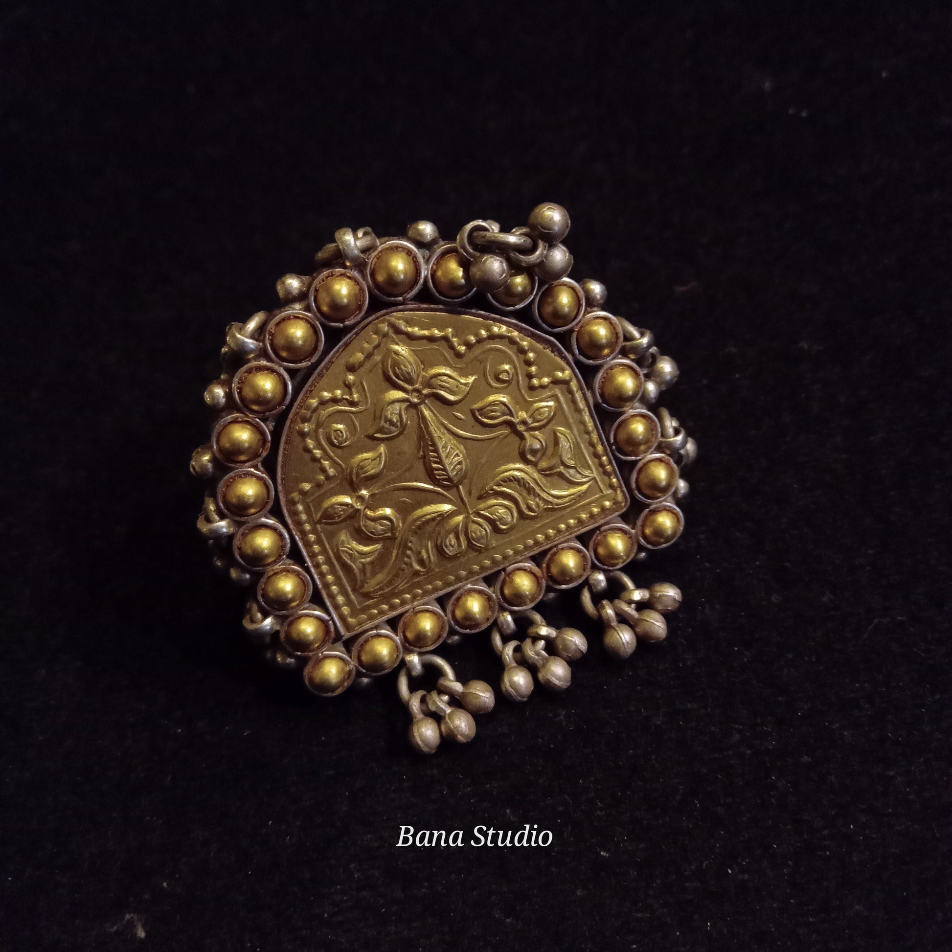 Vintage style dual tone gold fire gilded 925 silver adjustable ring from Rajasthan.