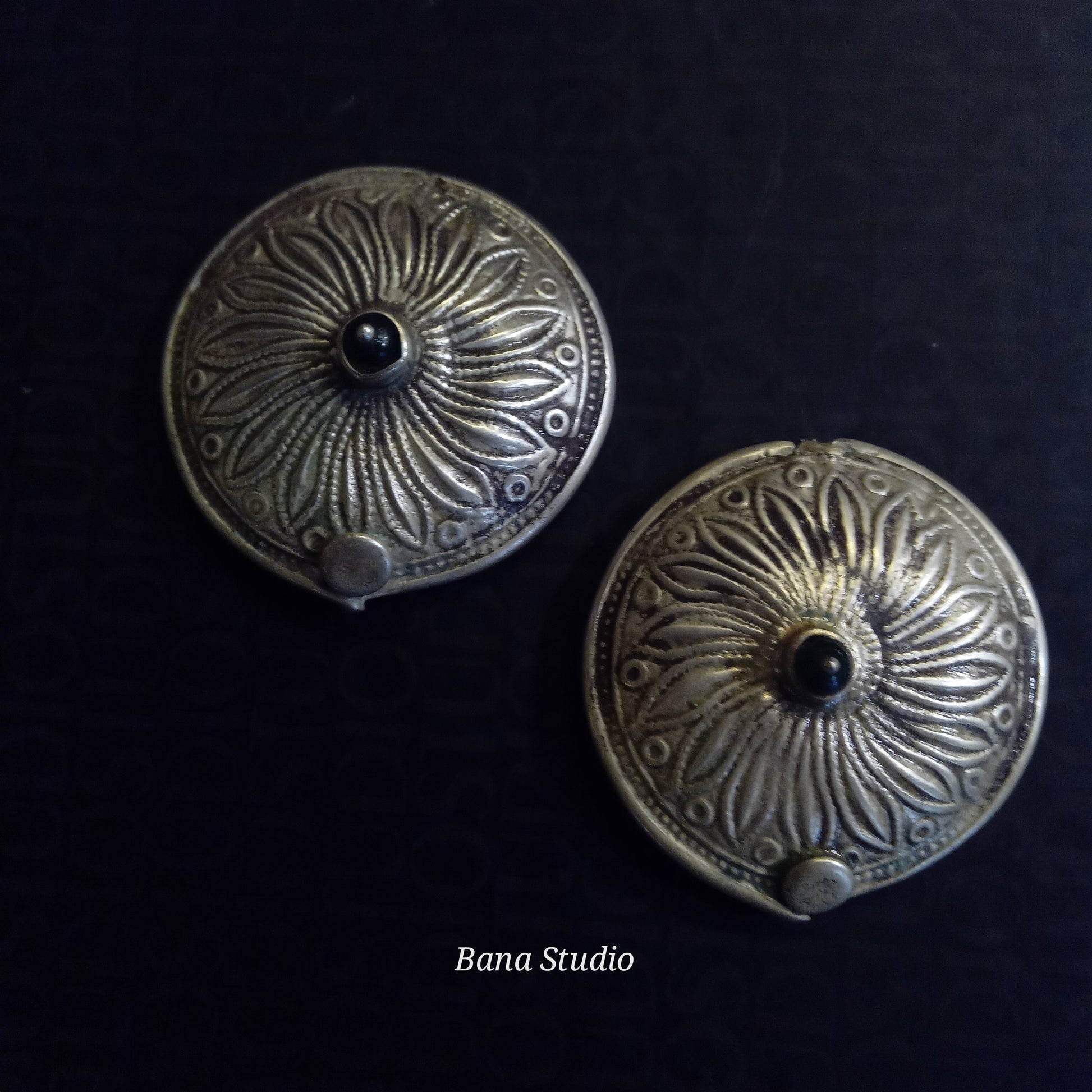 Feather weight Vintage silver earrings from Rajasthan studded with glass. Diameter 4.5cm