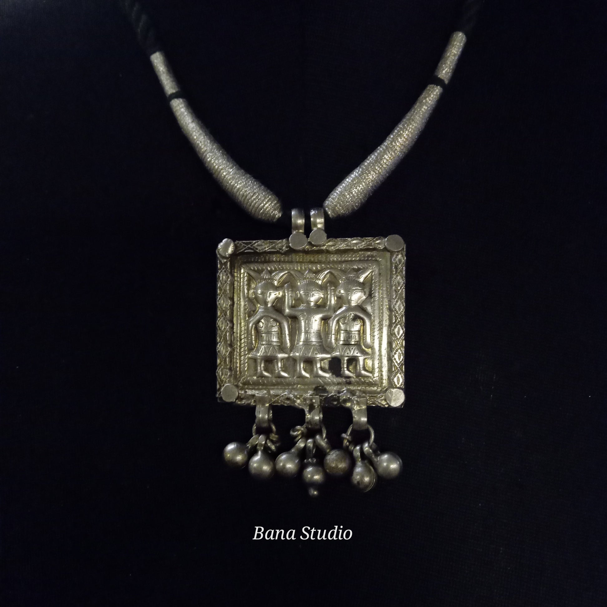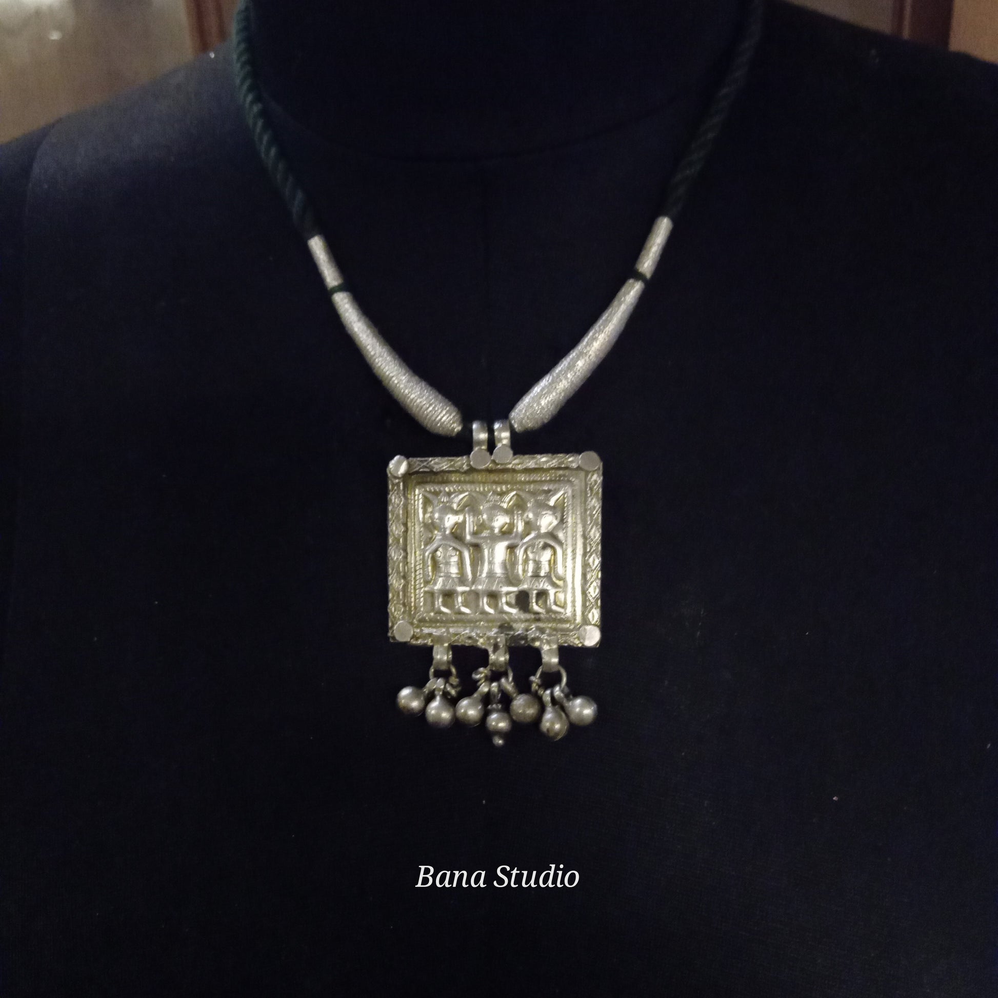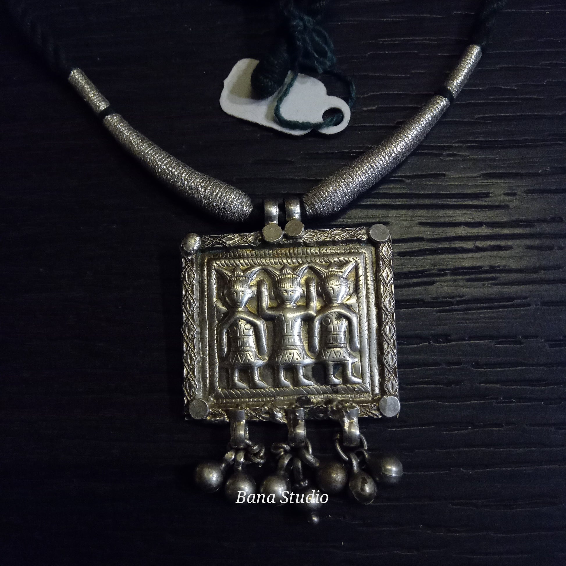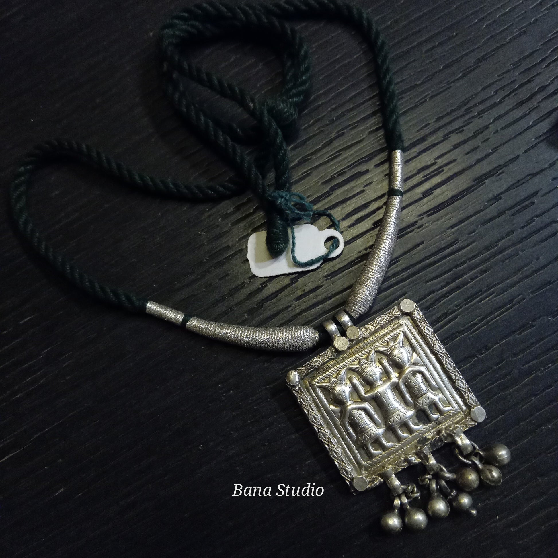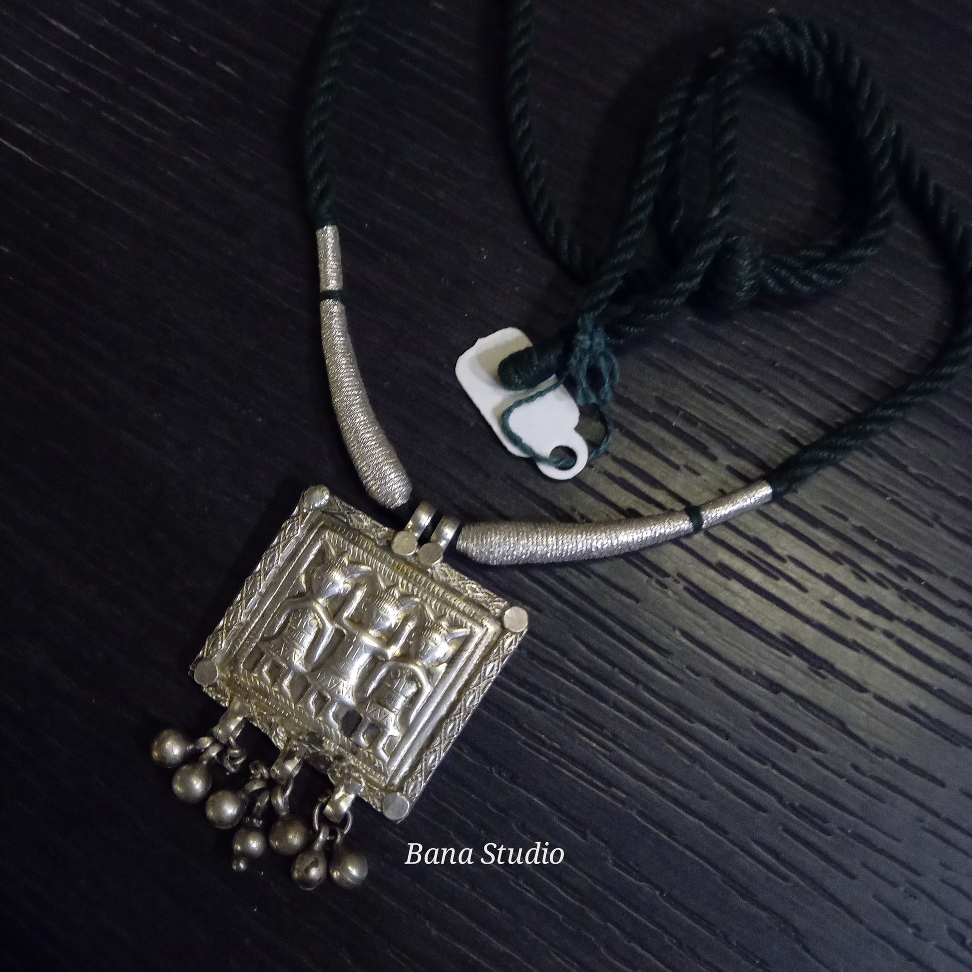 Vintage silver amulet pendant from Himachal pradesh strung in adjustable cotton thread.