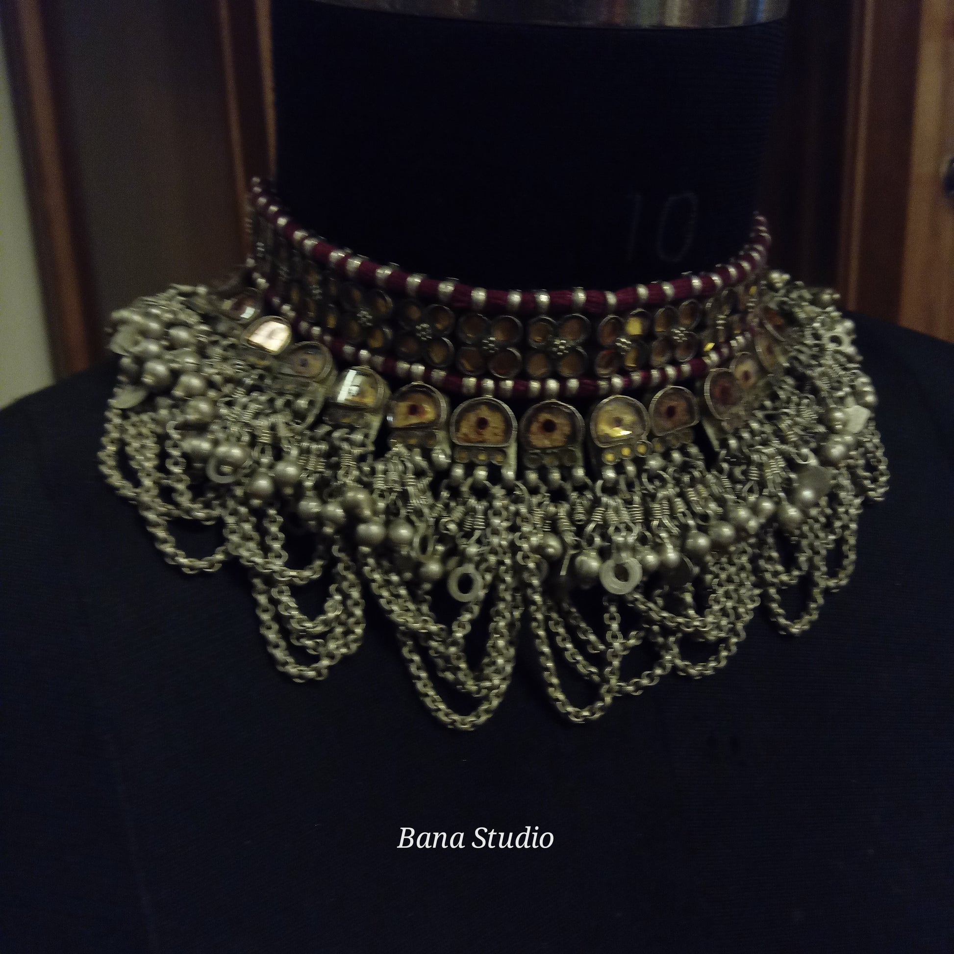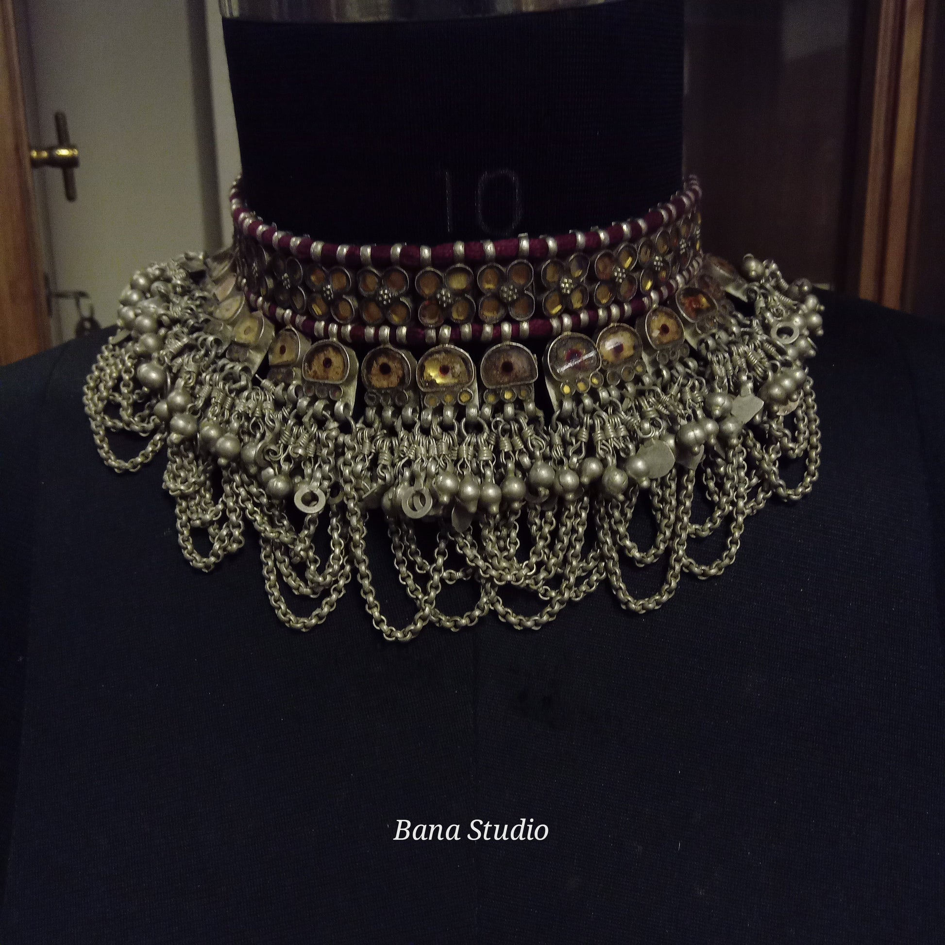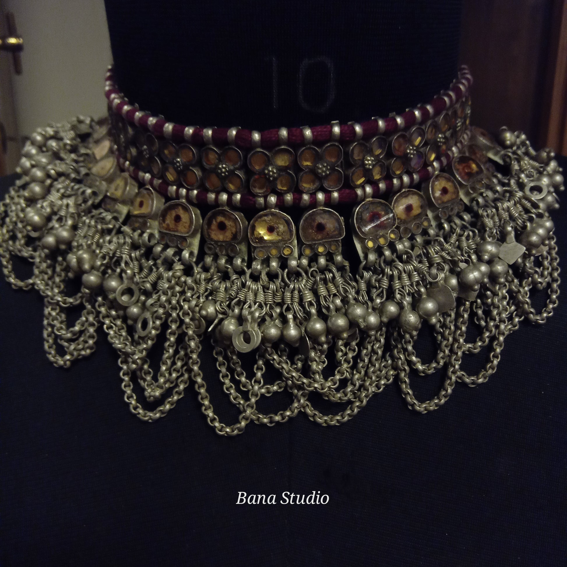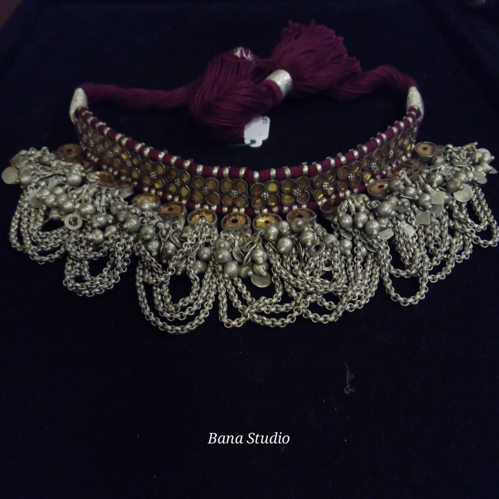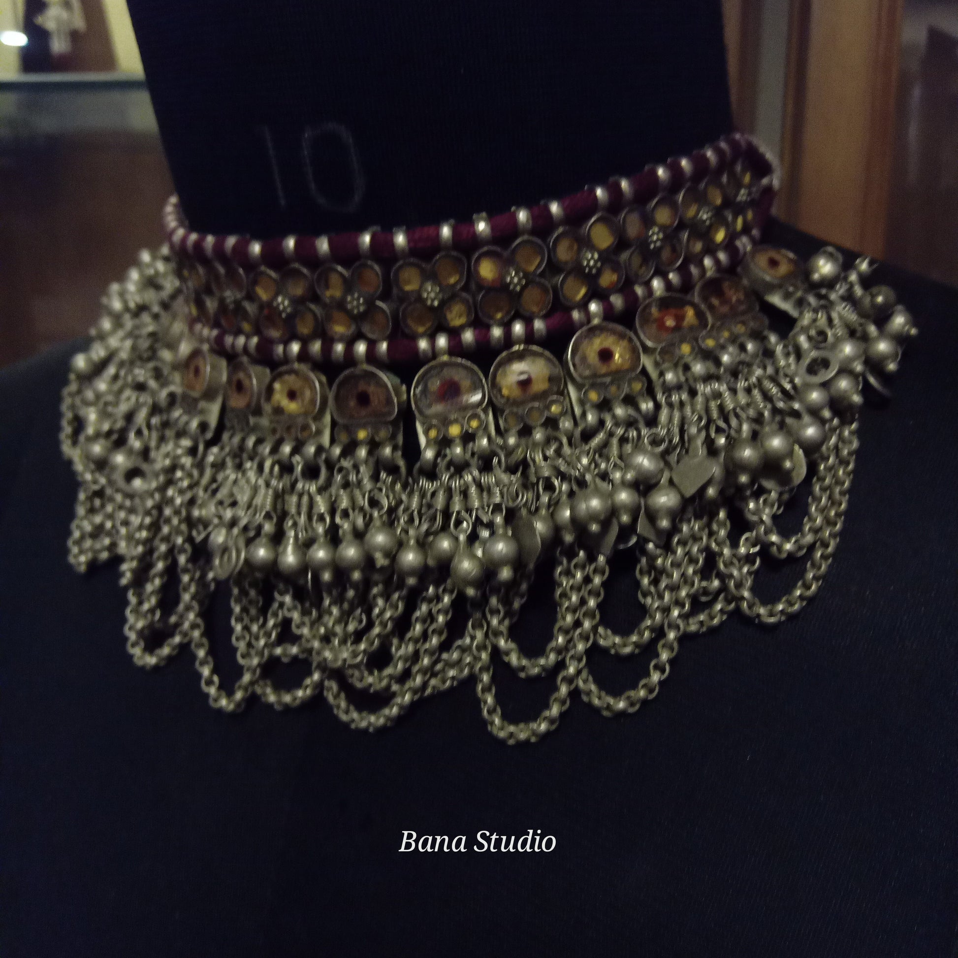 Vintage silver choker necklace from western Uttar Pradesh studded with foiled glass and strung in adjustable cotton thread.