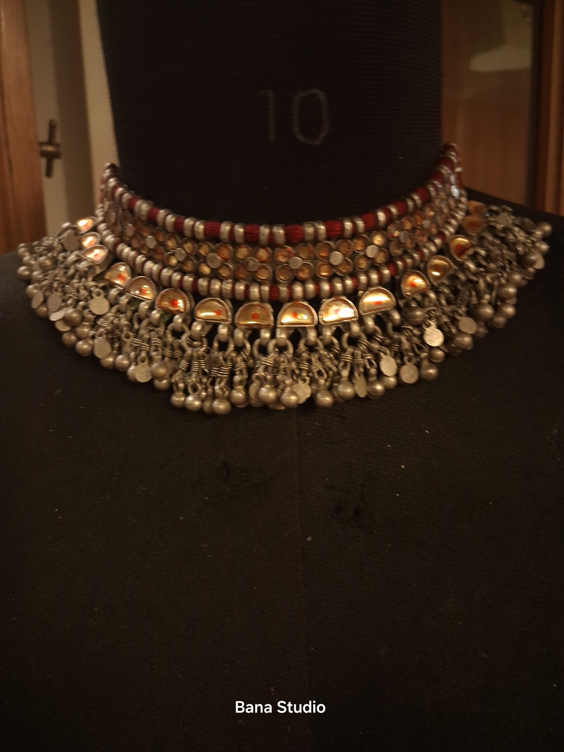 Vintage silver choker from western Uttar Pradesh studded with foiled glass and strung in adjustable cotton thread. LSAg/LHDg
