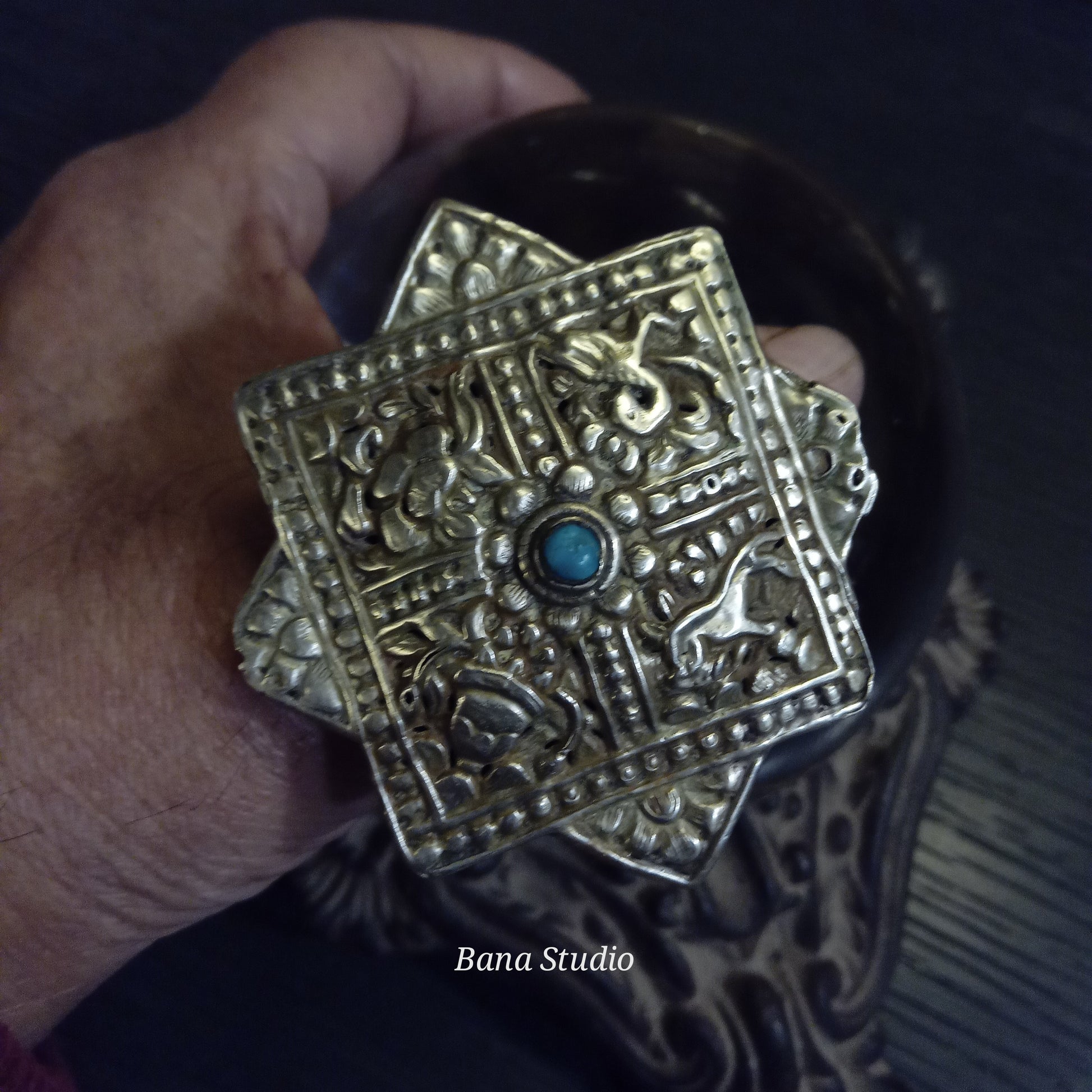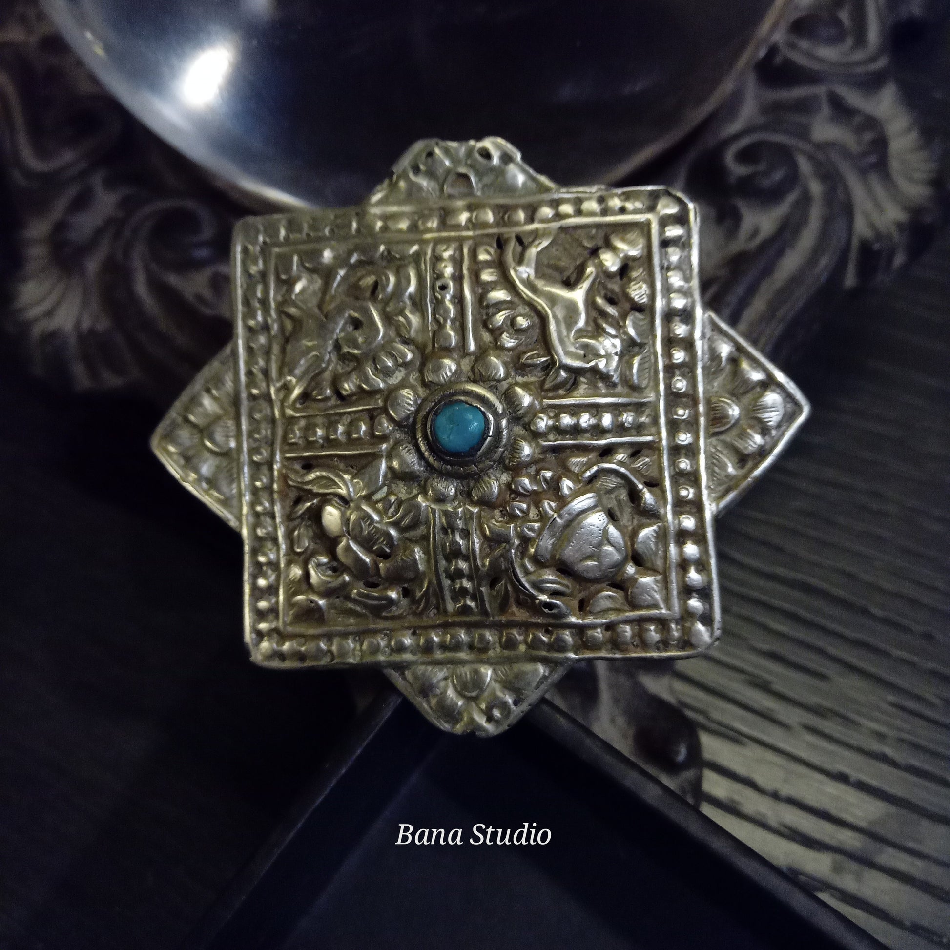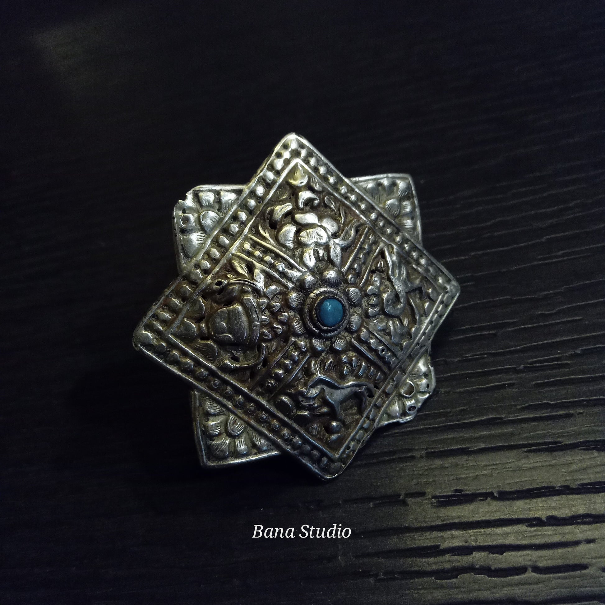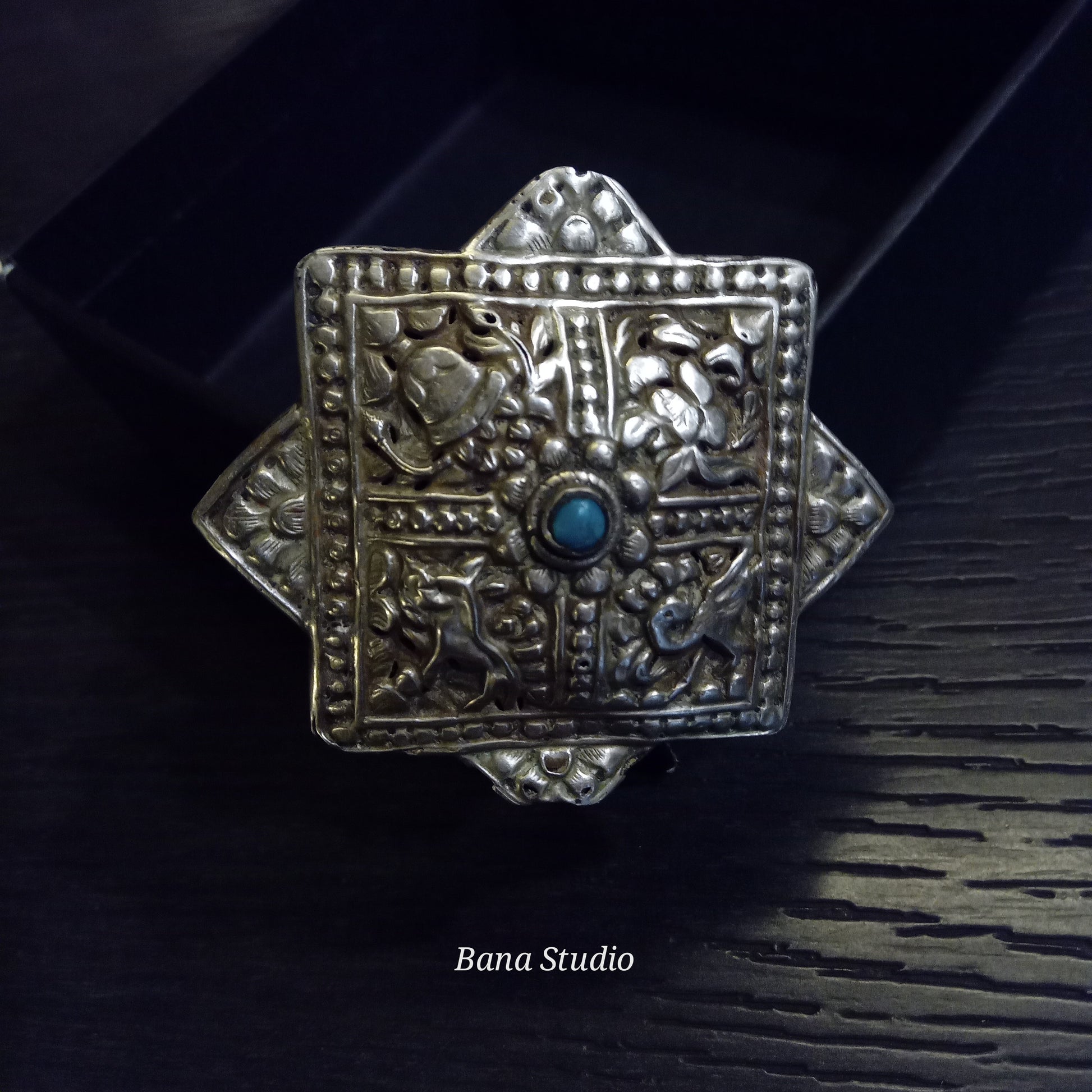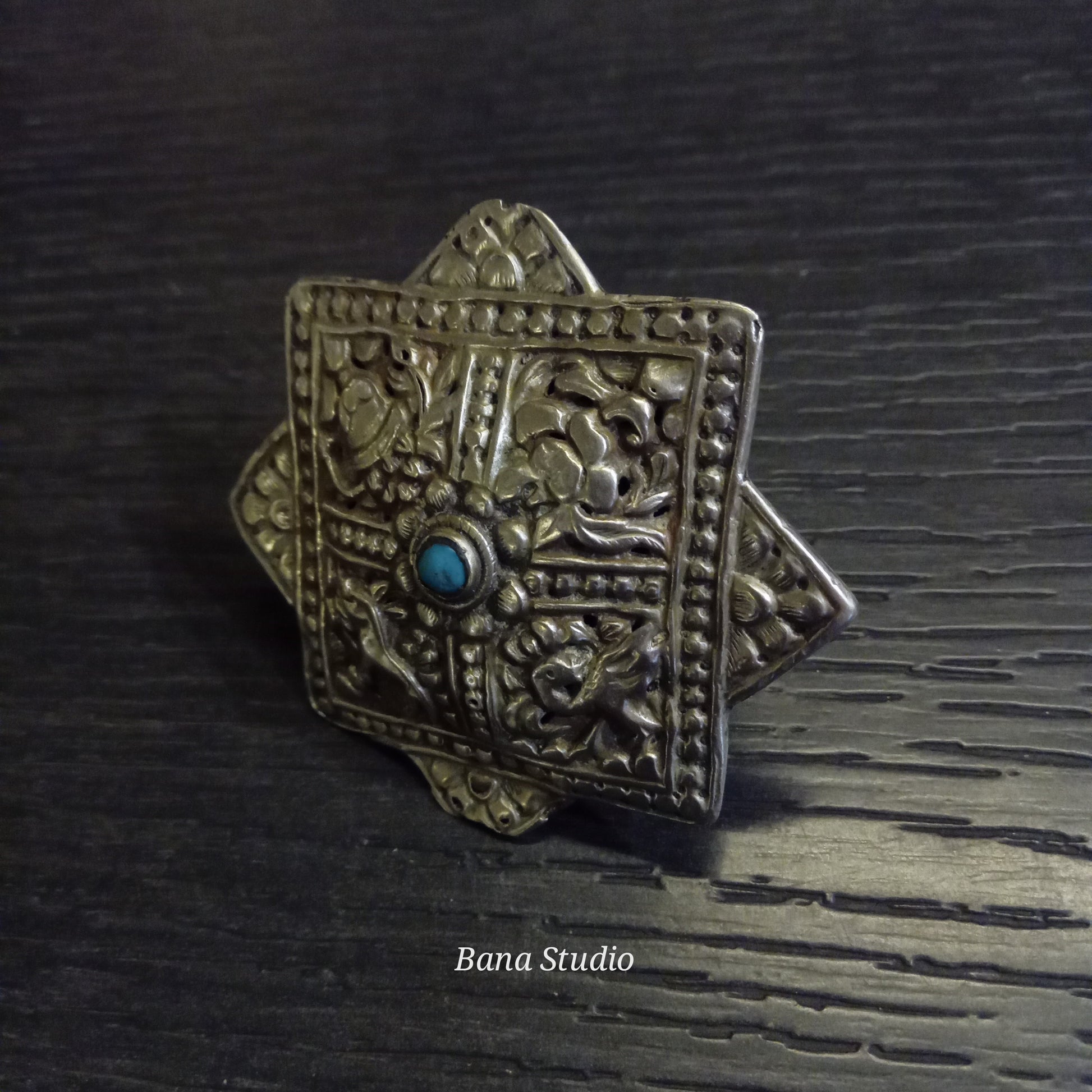 Vintage silver/mixed metal broach from Bhutan called "Korma" with auspicious buddhist repoussé work converted into adjustable ring studded with natural real Turquoise.