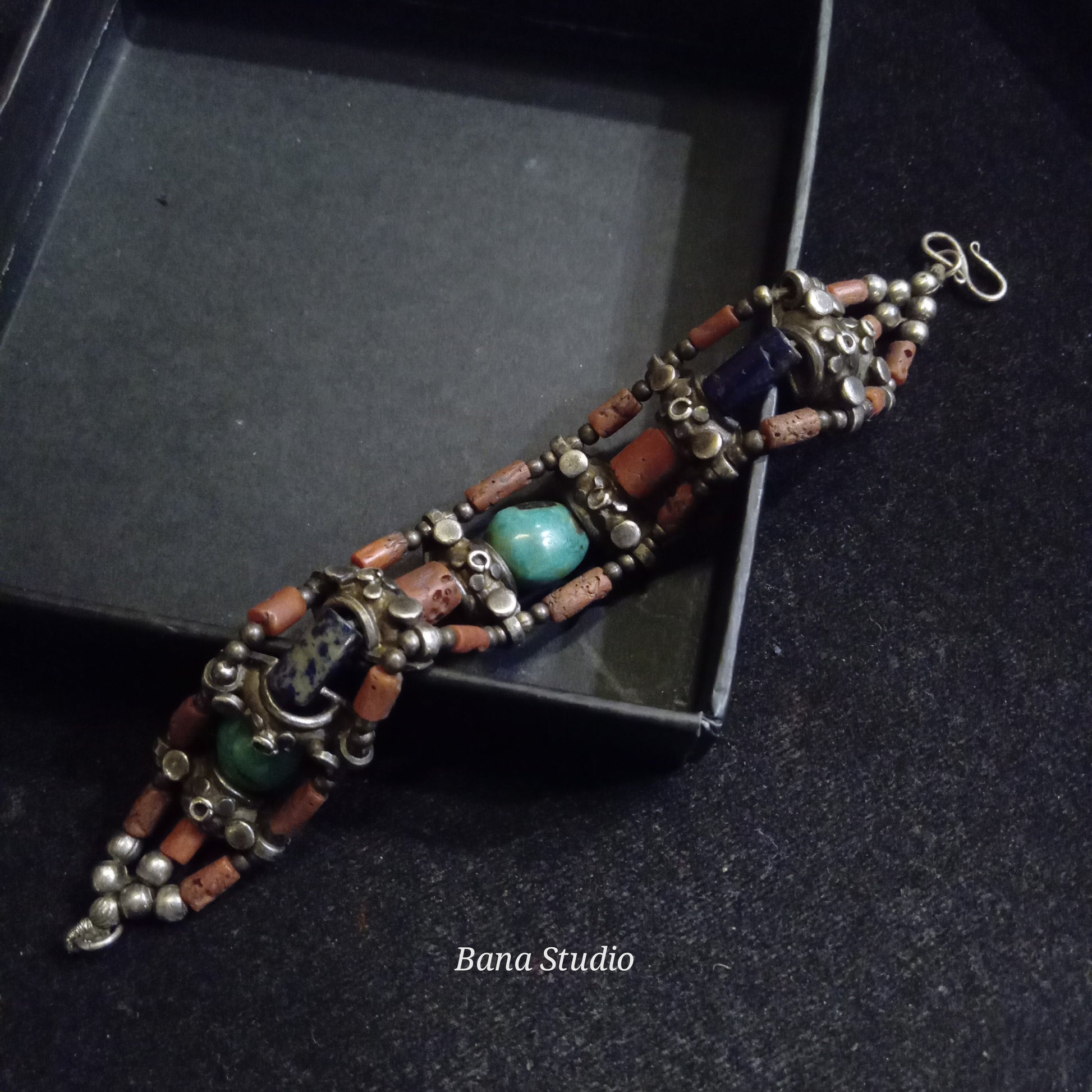 Vintage style 925 silver bracelet with real natural corals and turquoise. Length 8 inch. Width 2cm