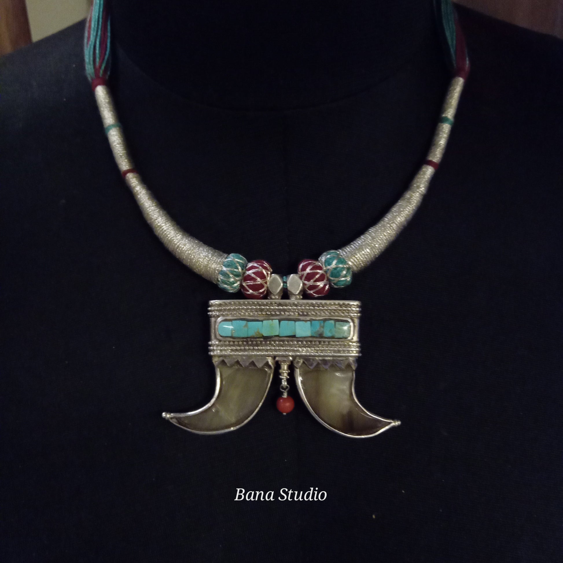 Vintage style 925 silver tiger claw motif amulet pendant studded with real natural turquoise and polished horn and strung in adjustable cotton thread.
