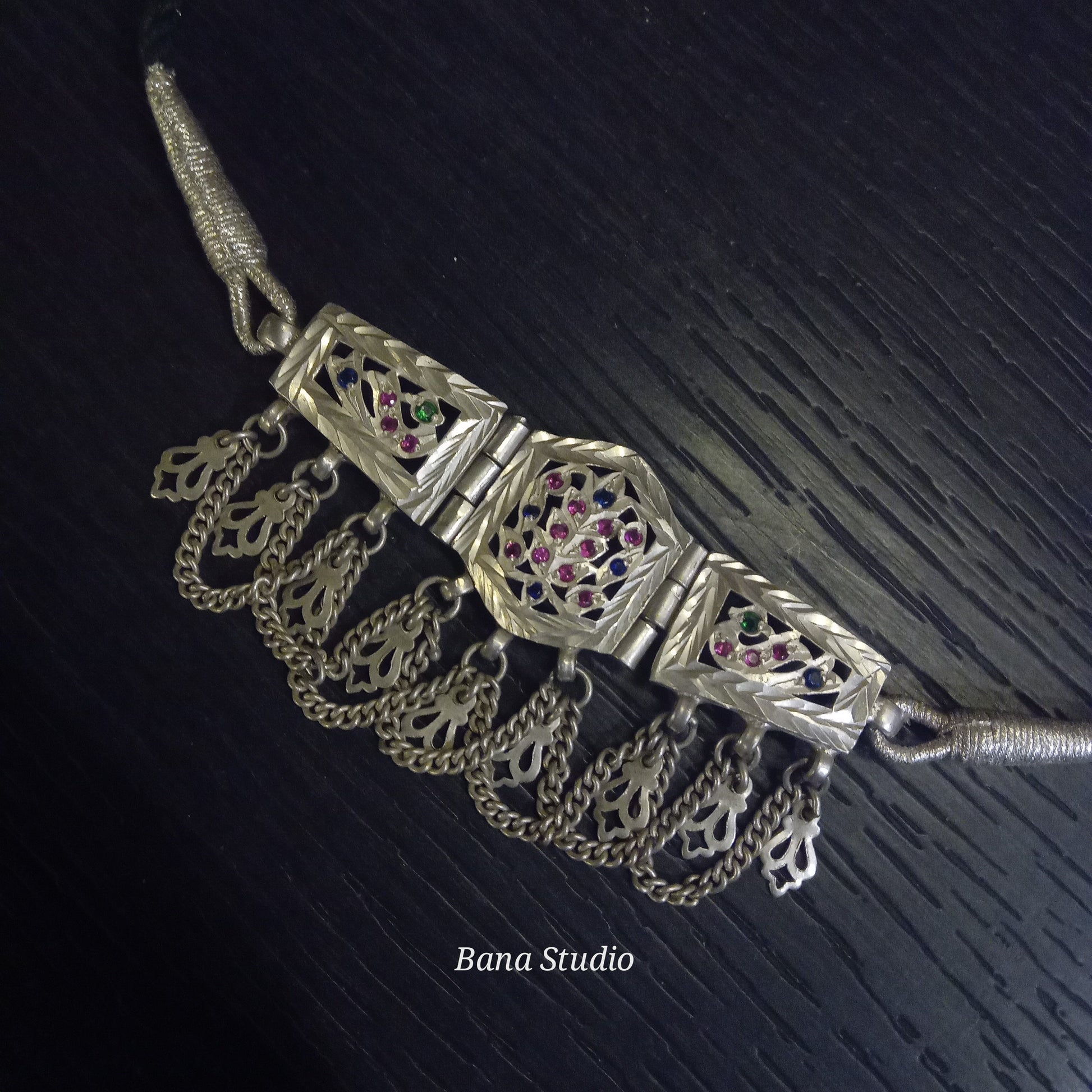 Vintage silver choker necklace from Rajasthan studded with glass and strung in adjustable cotton thread.