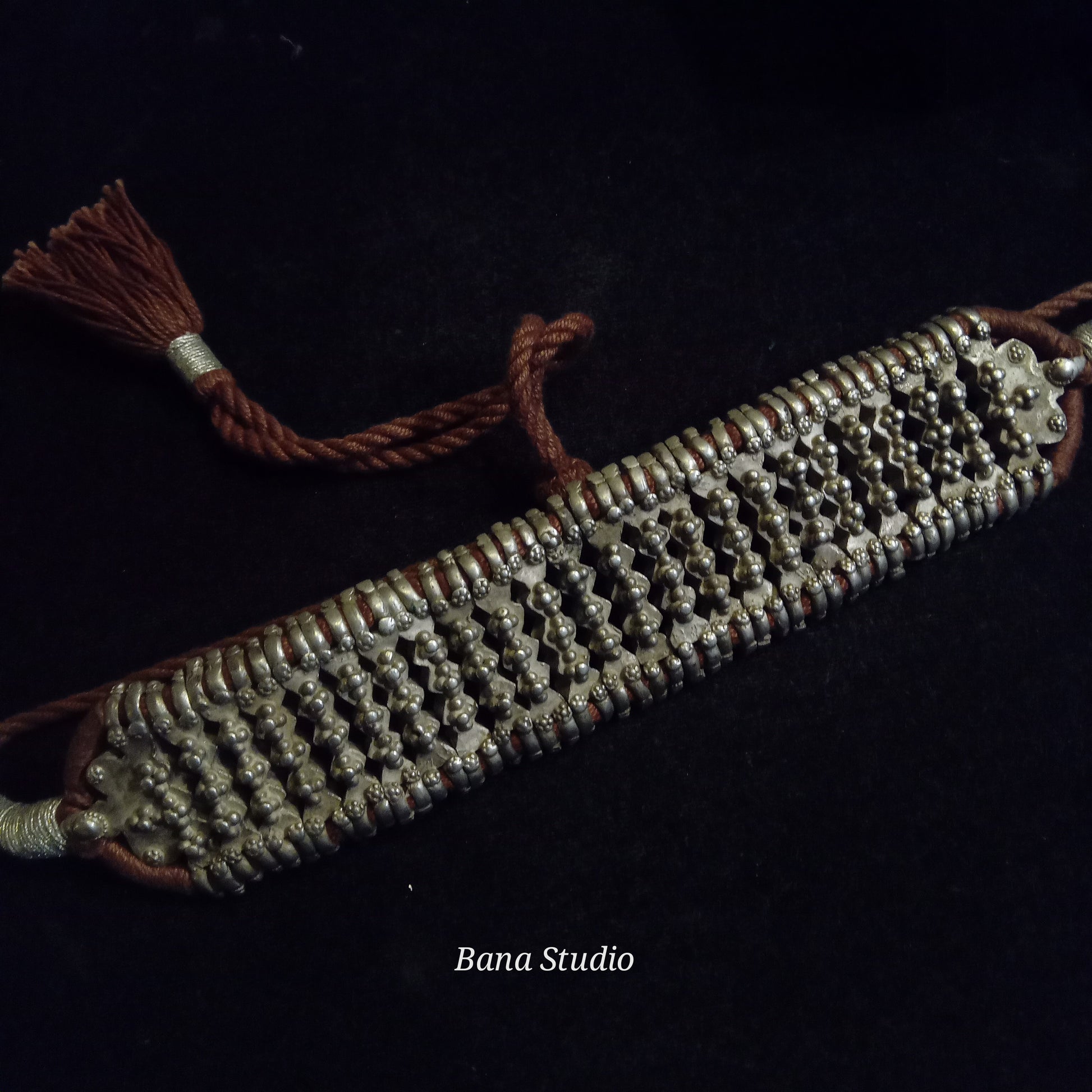 Vintage silver Guluband from Madhya pradesh strung in adjustable cotton thread. Width 4cm