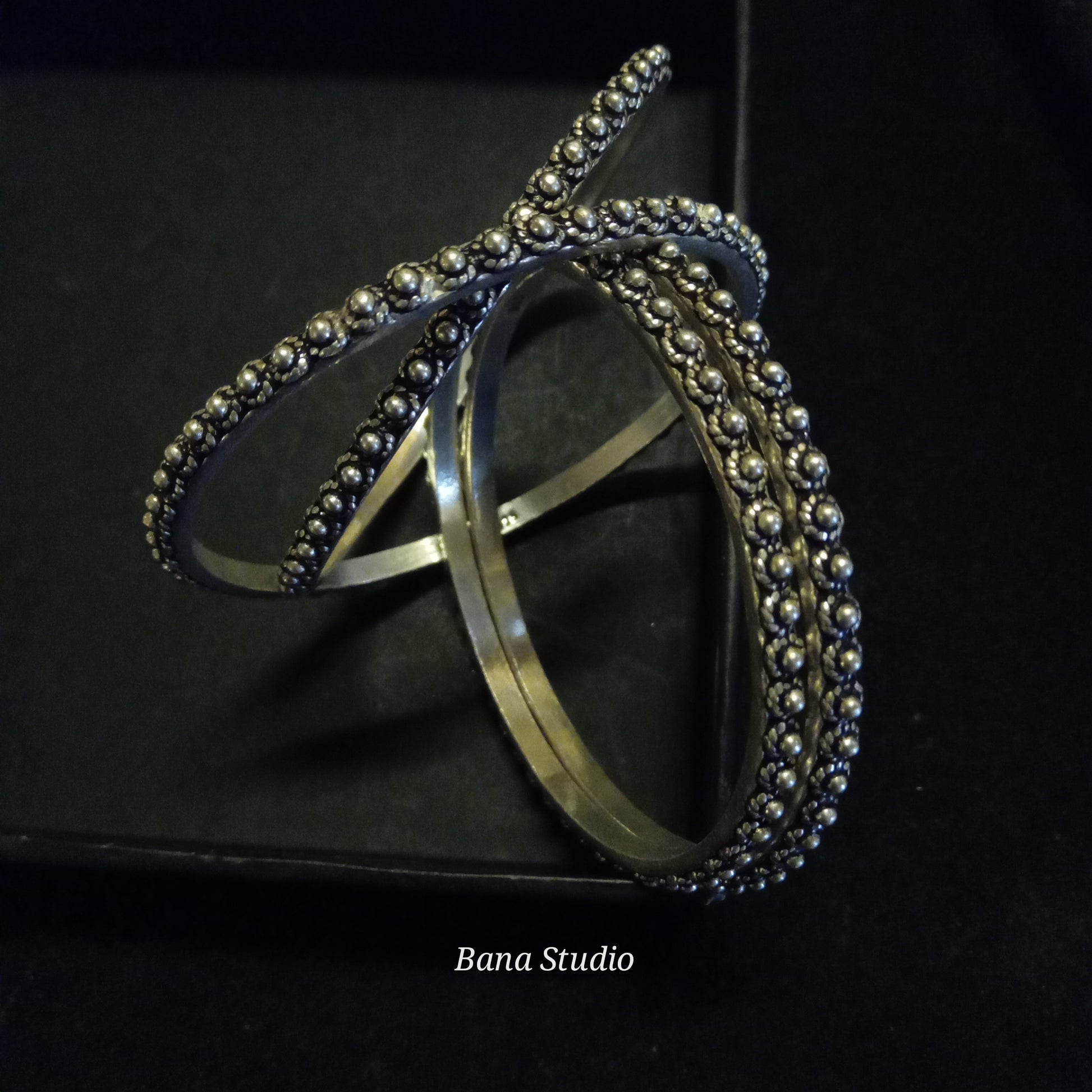 கையால் வடிவமைக்கப்பட்ட நேர்த்தியான வெள்ளி வளையல்கள்.