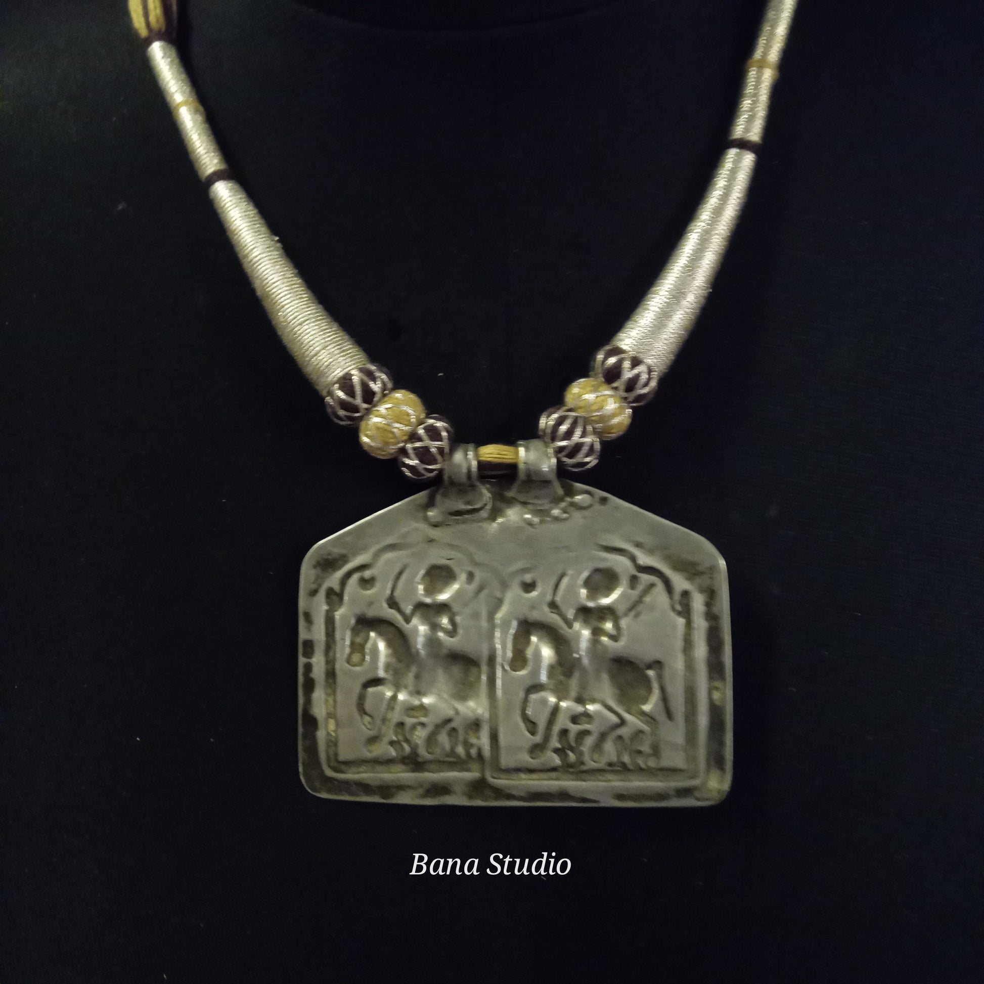 Vintage silver amulet pendant from Rajasthan strung in adjustable cotton thread.