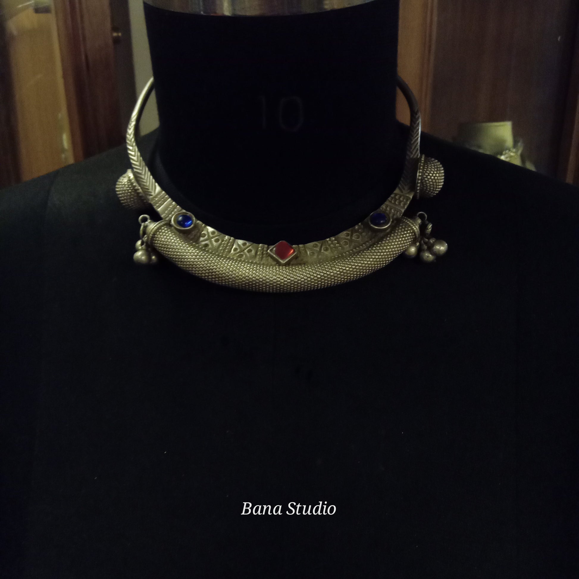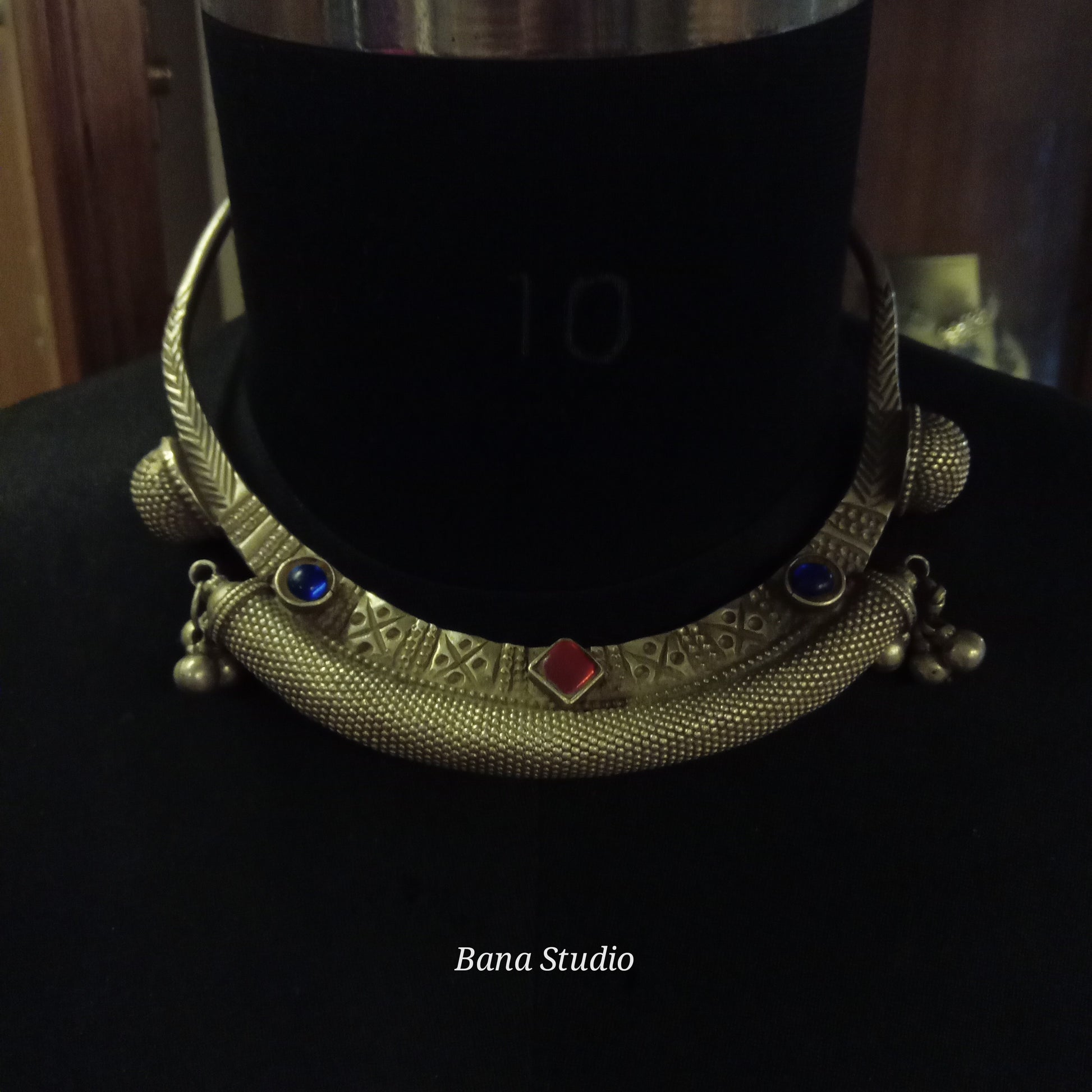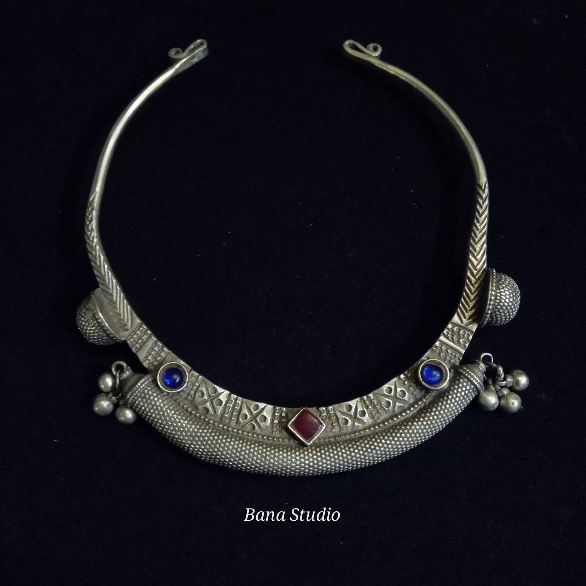 Vintage silver Hasli from Rajasthan studded with glass.