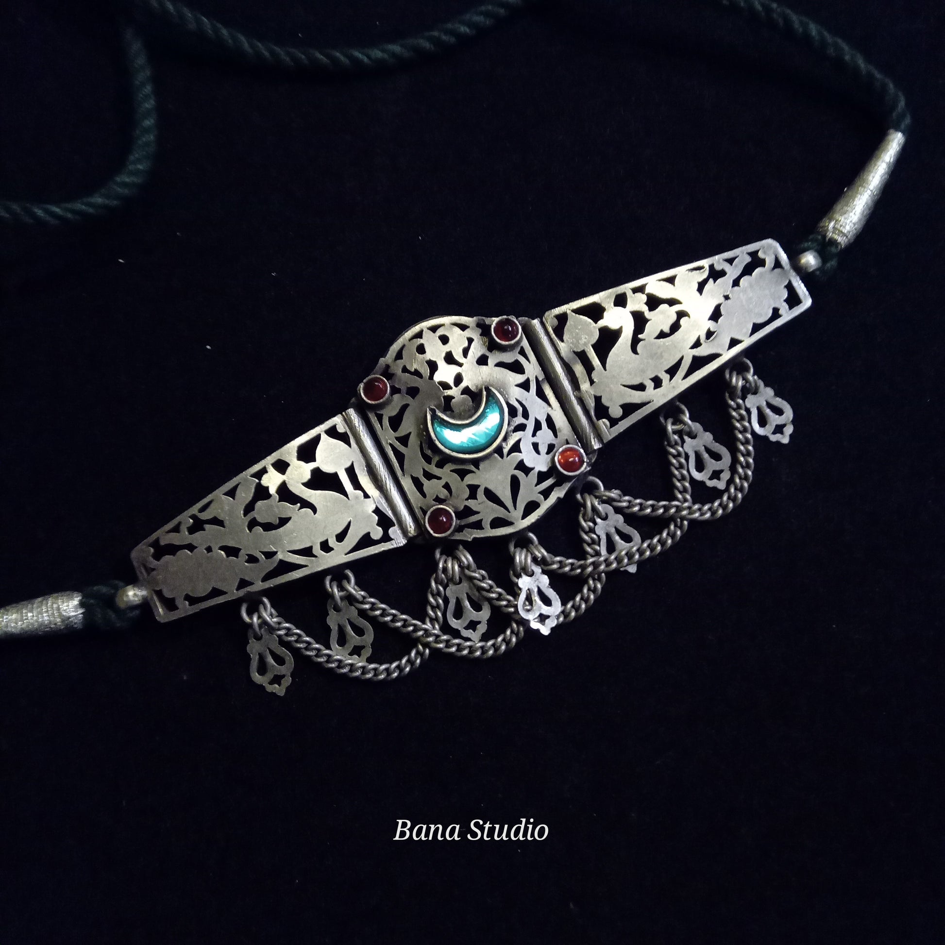 Vintage silver choker necklace from Rajasthan studded with glass and strung in adjustable cotton thread.