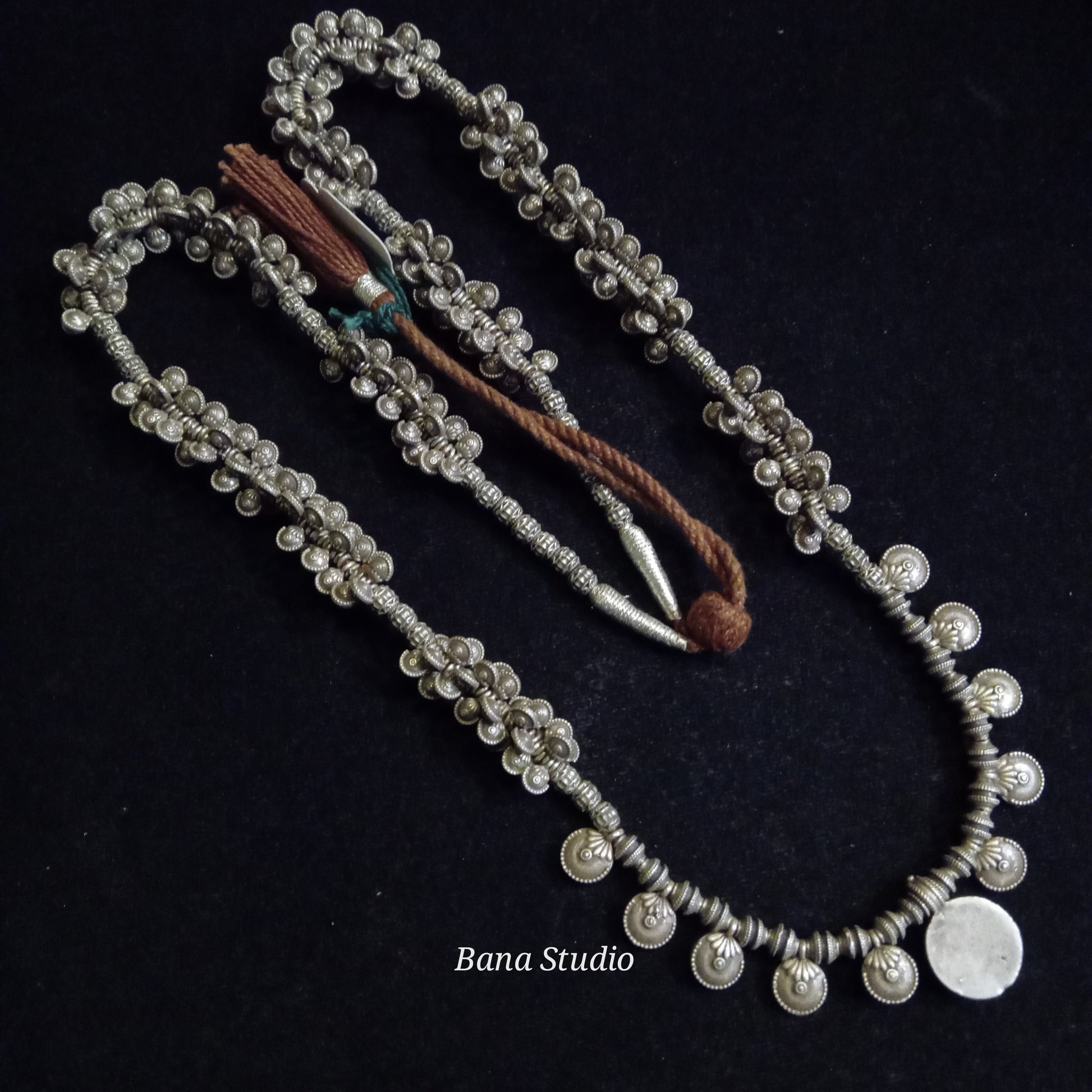 Vintage silver necklace from Odhisa strung in adjustable cotton thread.