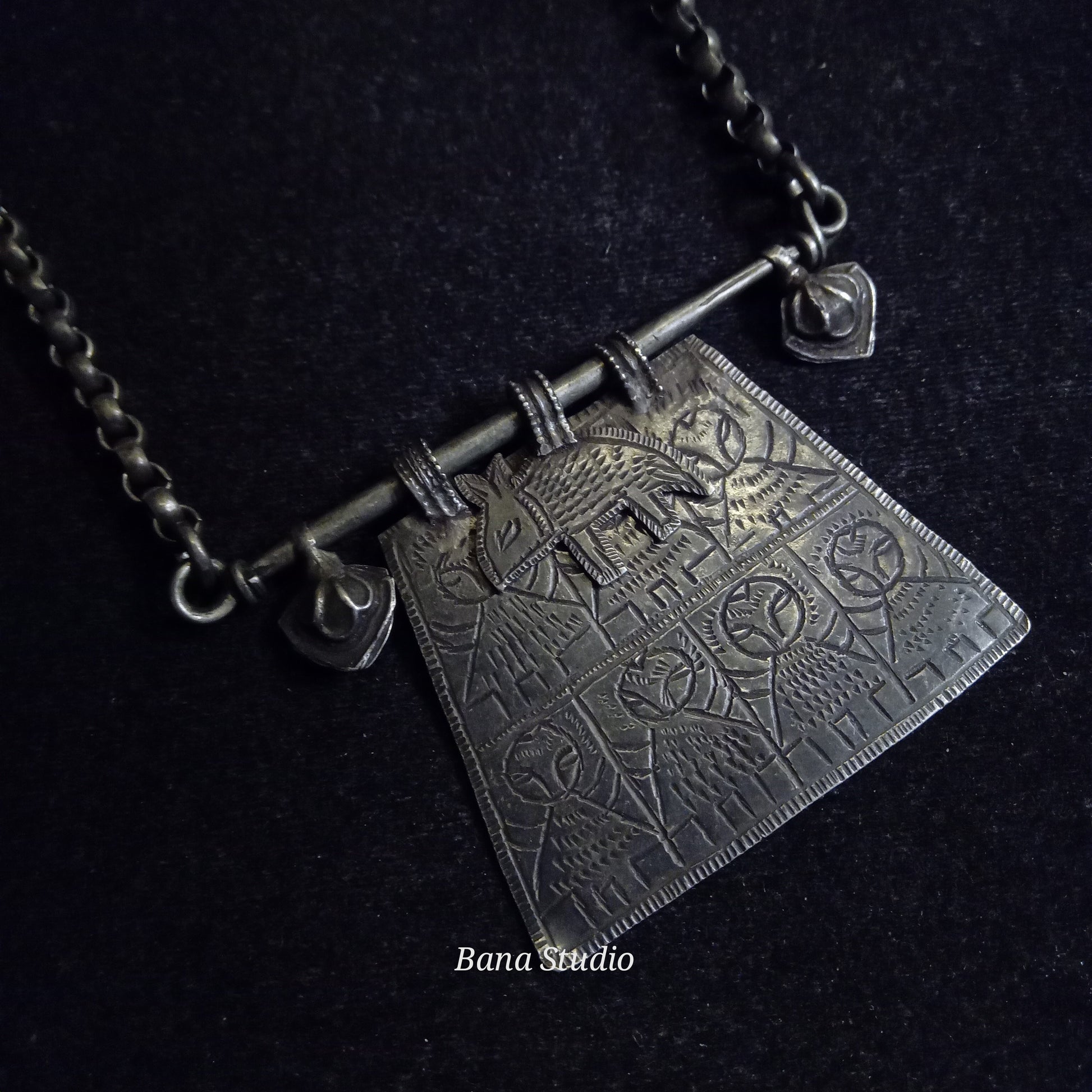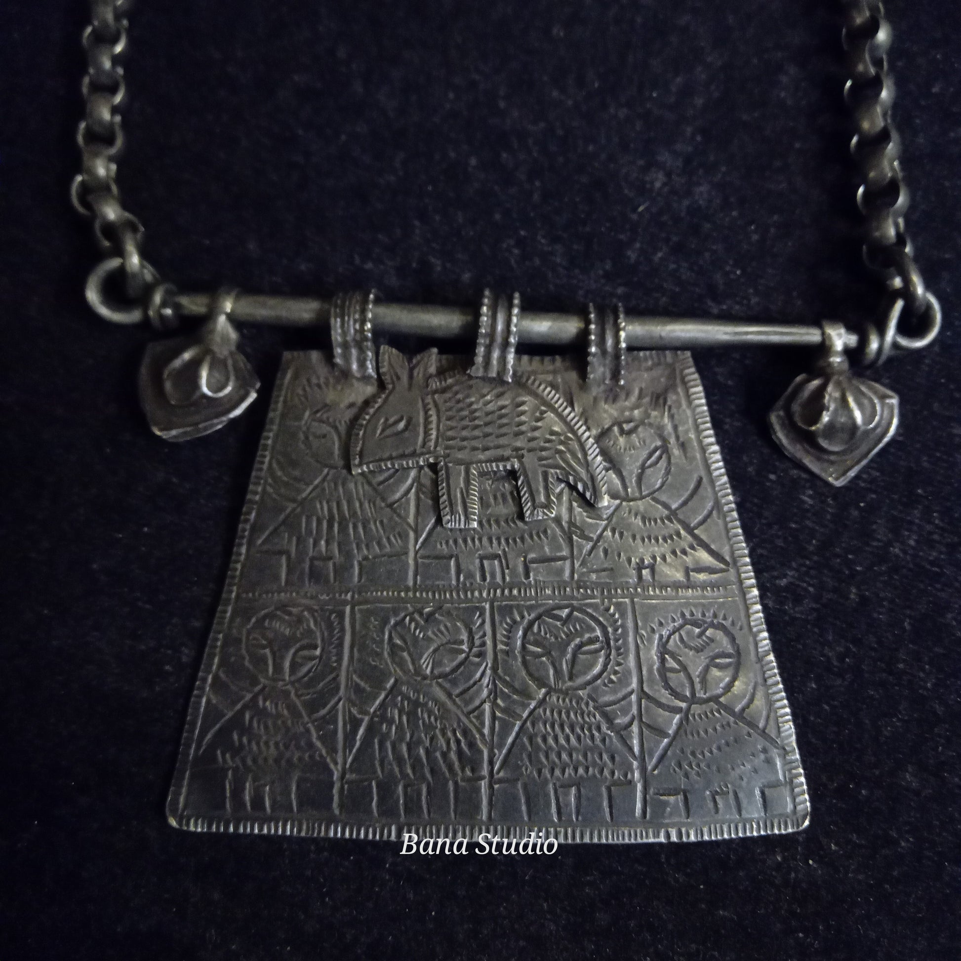 Vintage silver amulet pendant with seven goddess on chain from Rajasthan. Drop of necklace 17 inch