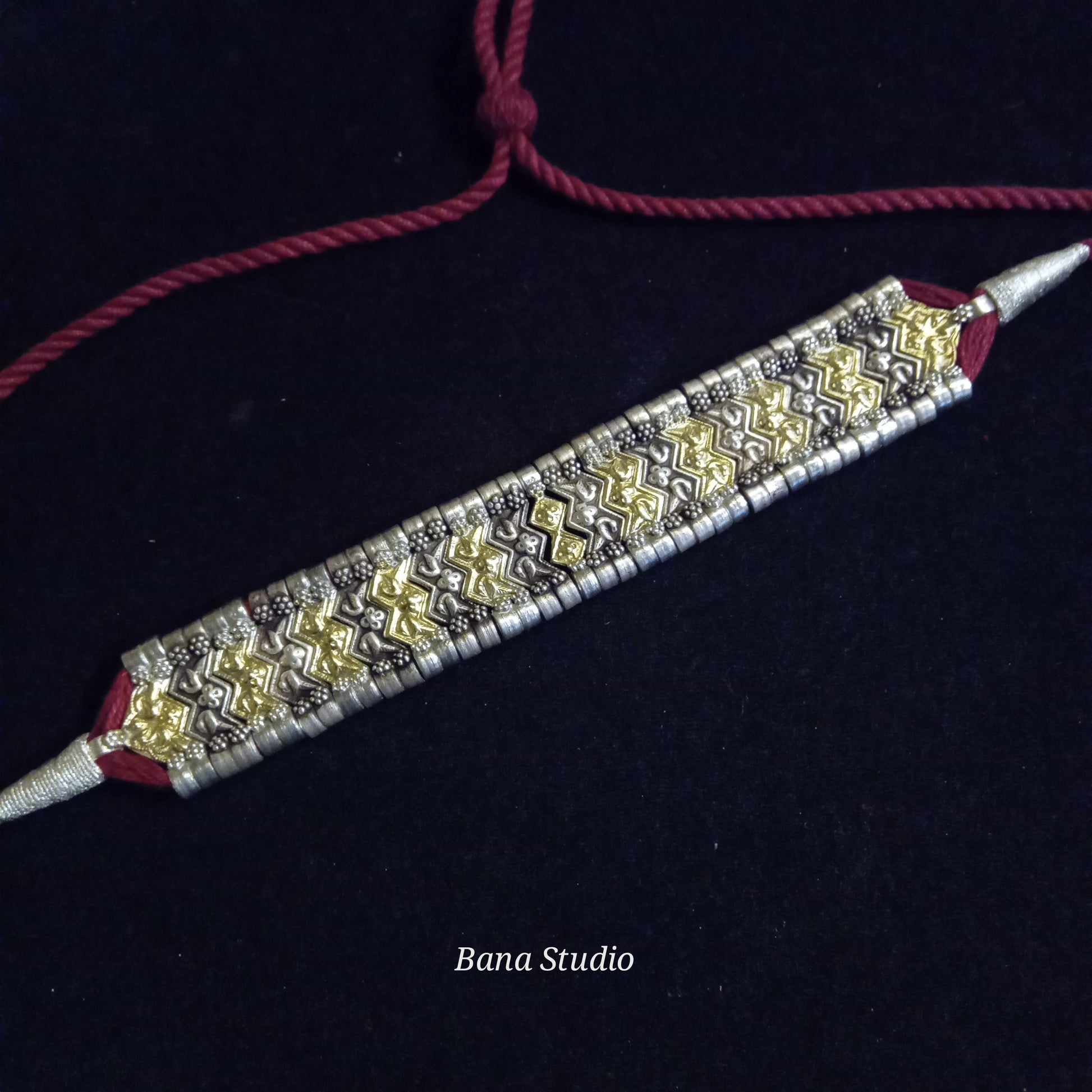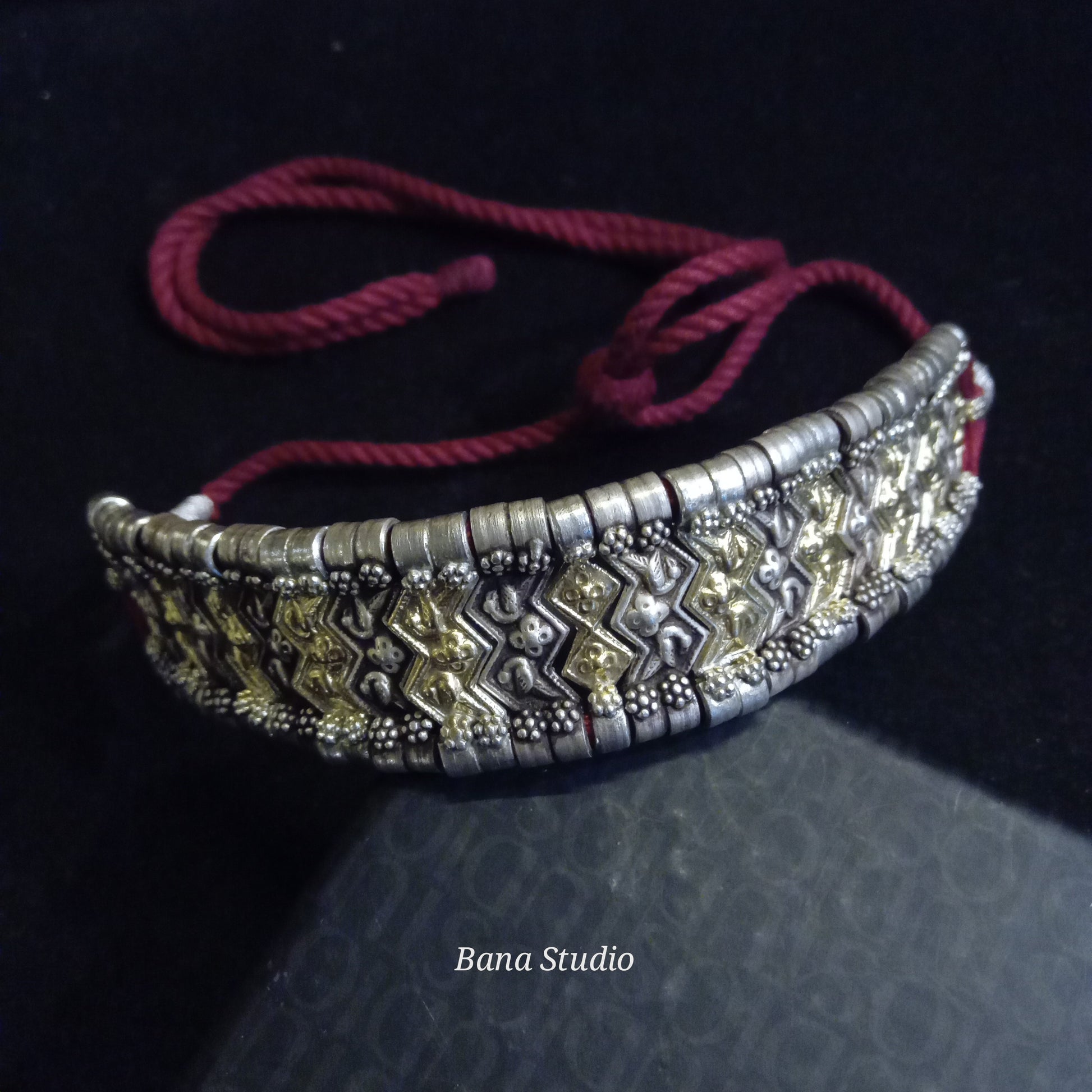 Vintage style dual tone gold fire gilded silver choker necklace from Rajasthan strung in adjustable cotton thread.