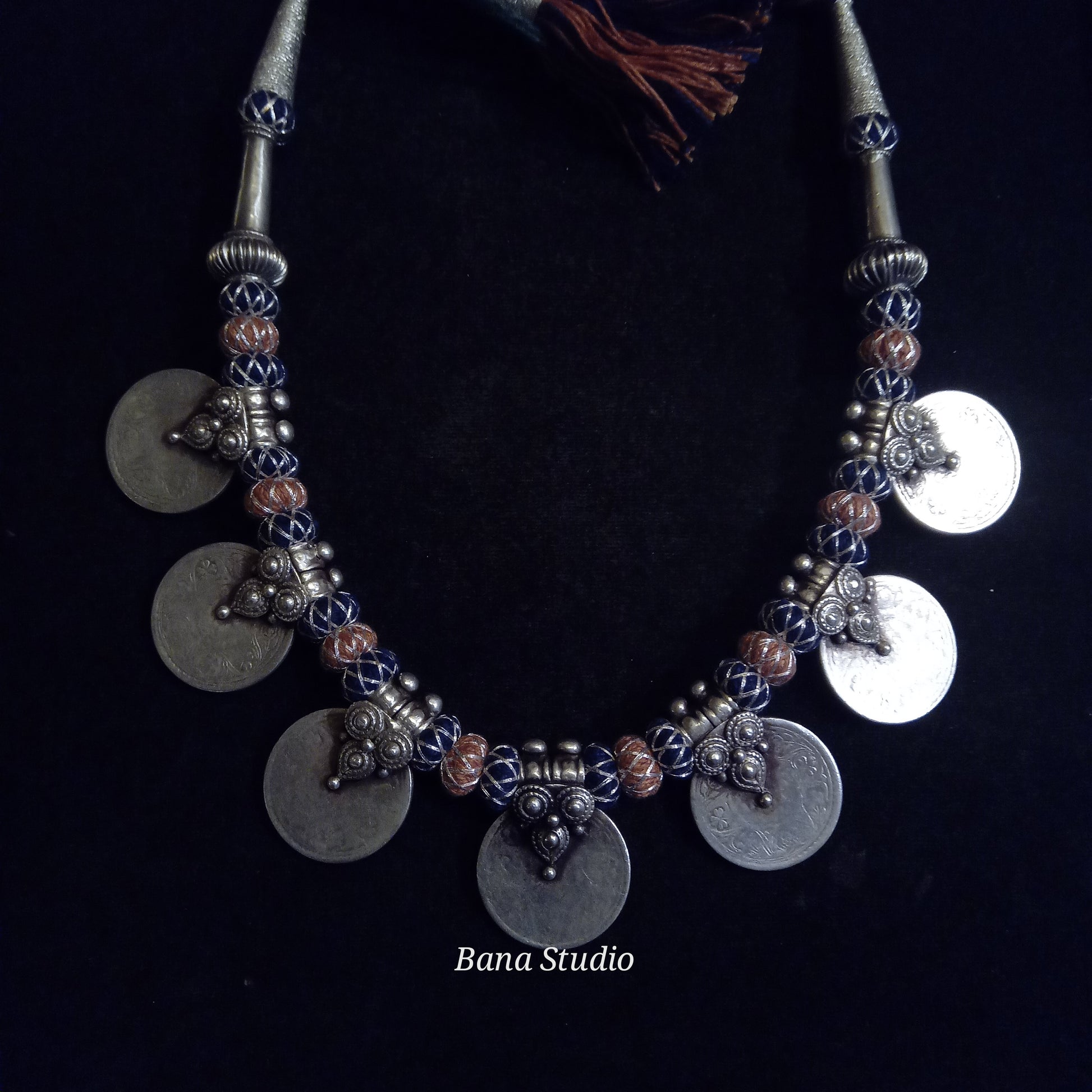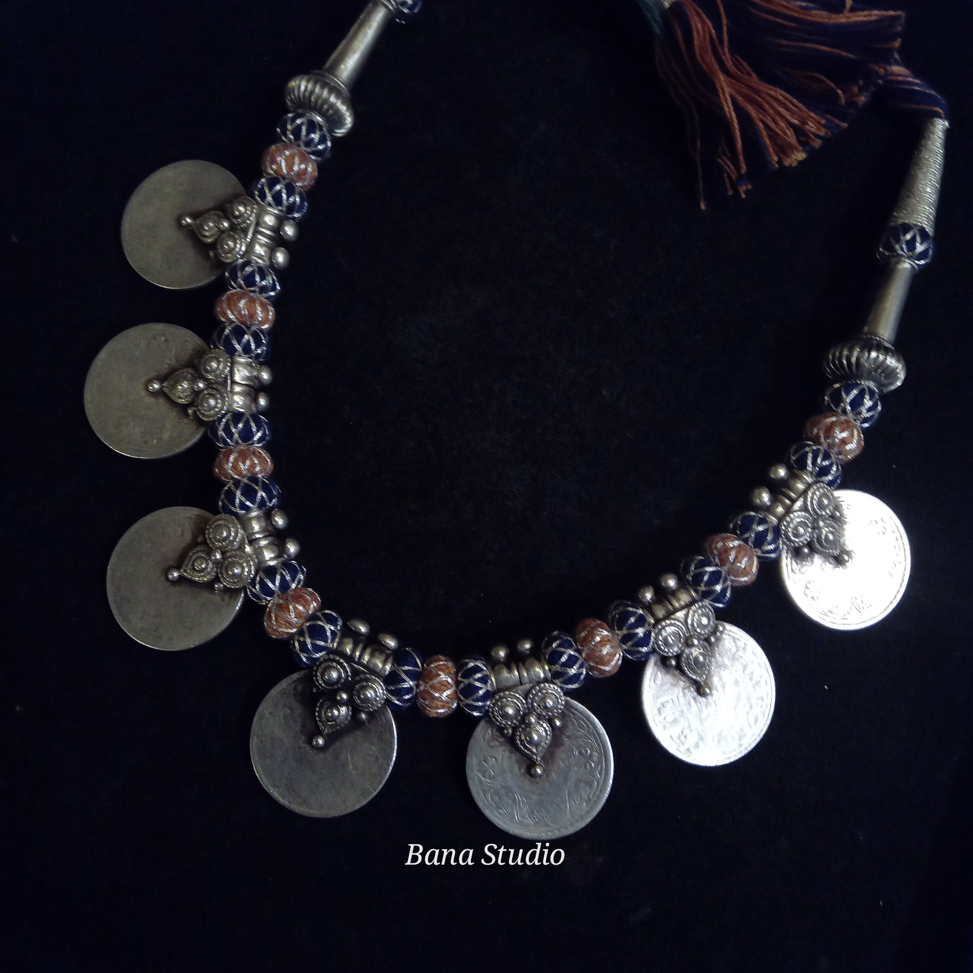 Vintage silver necklace from Odhisa with British coins strung with adjustable cotton thread.