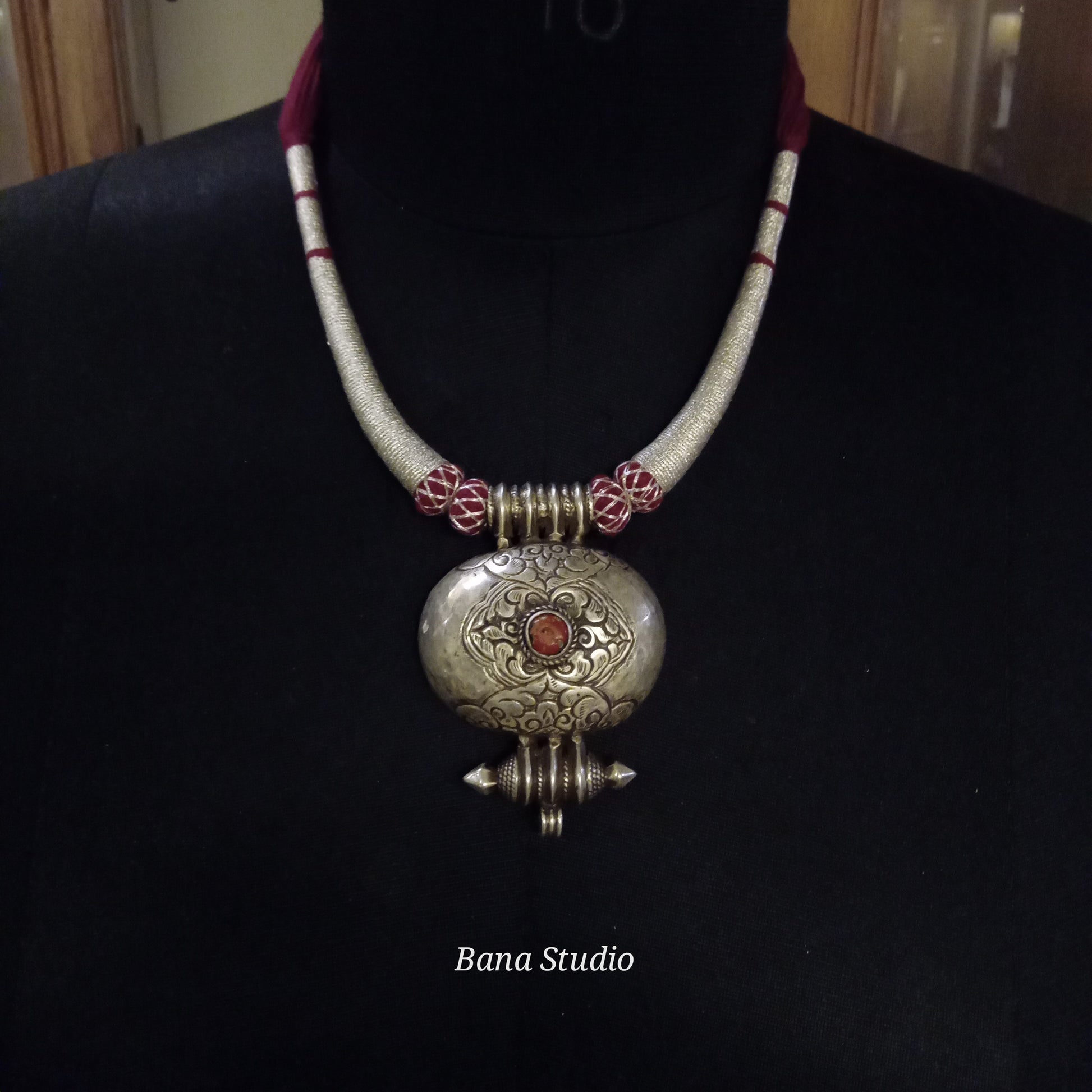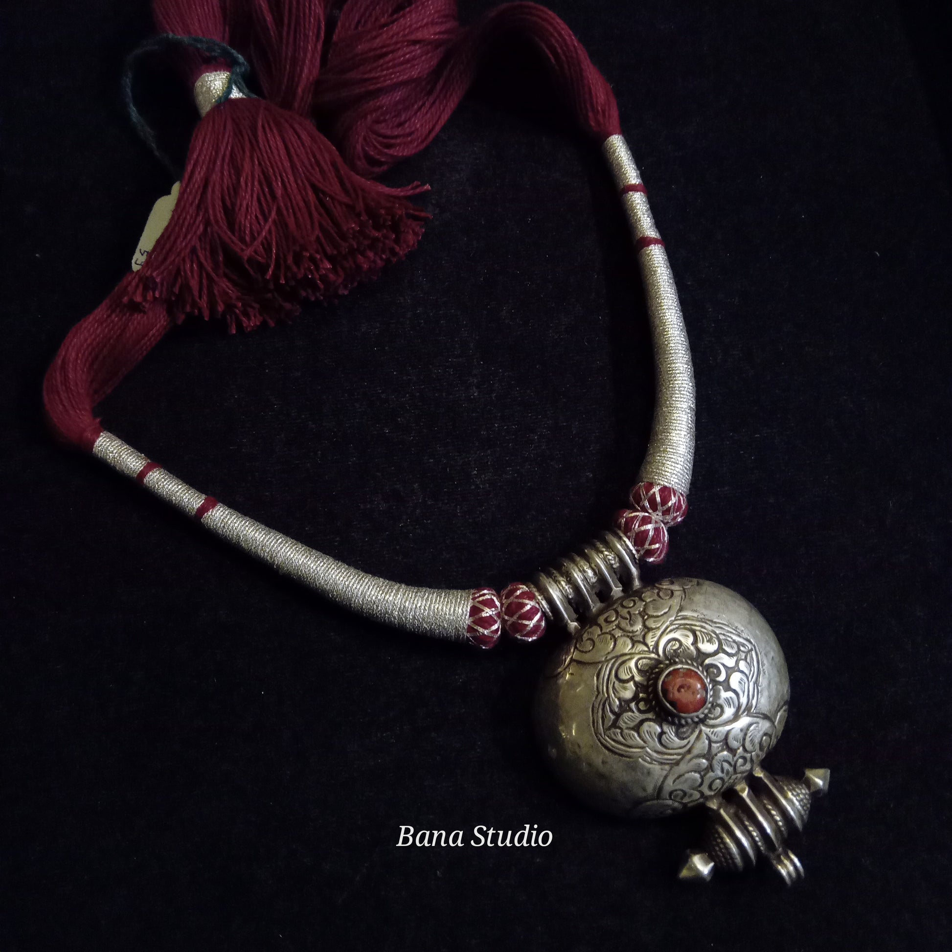 Vintage silver Buddhist Gau pendant from Ladakh studded with coral and strung in adjustable cotton thread. Height 8cm and width 6cm