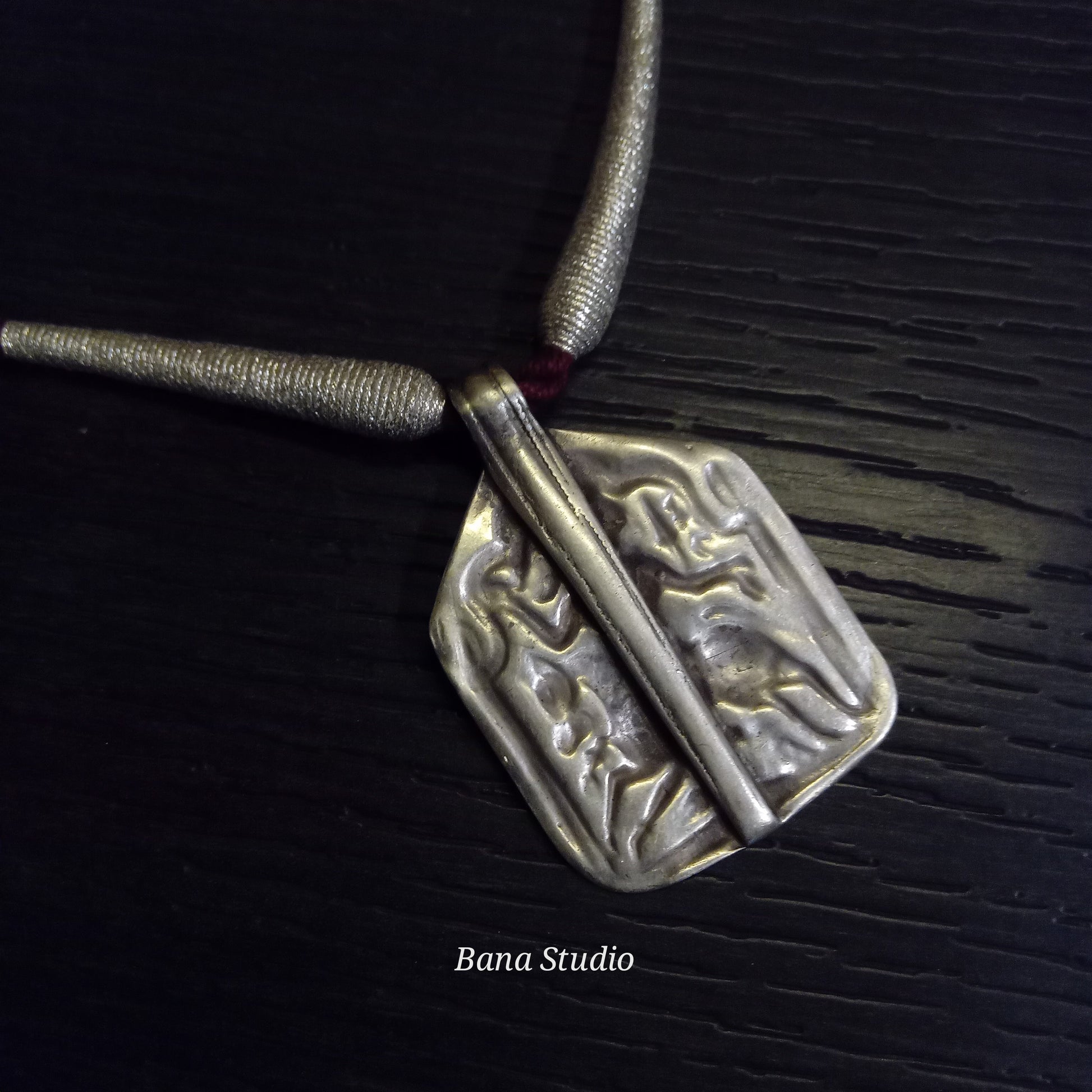 Vintage silver amulet pendant from Rajasthan strung in adjustable cotton thread.