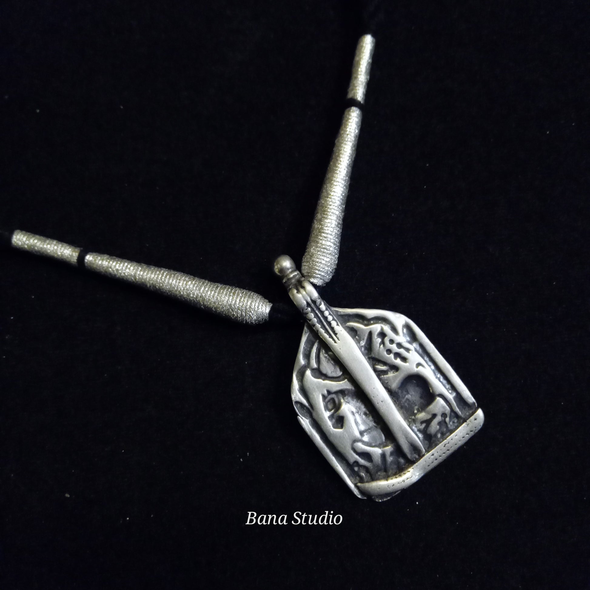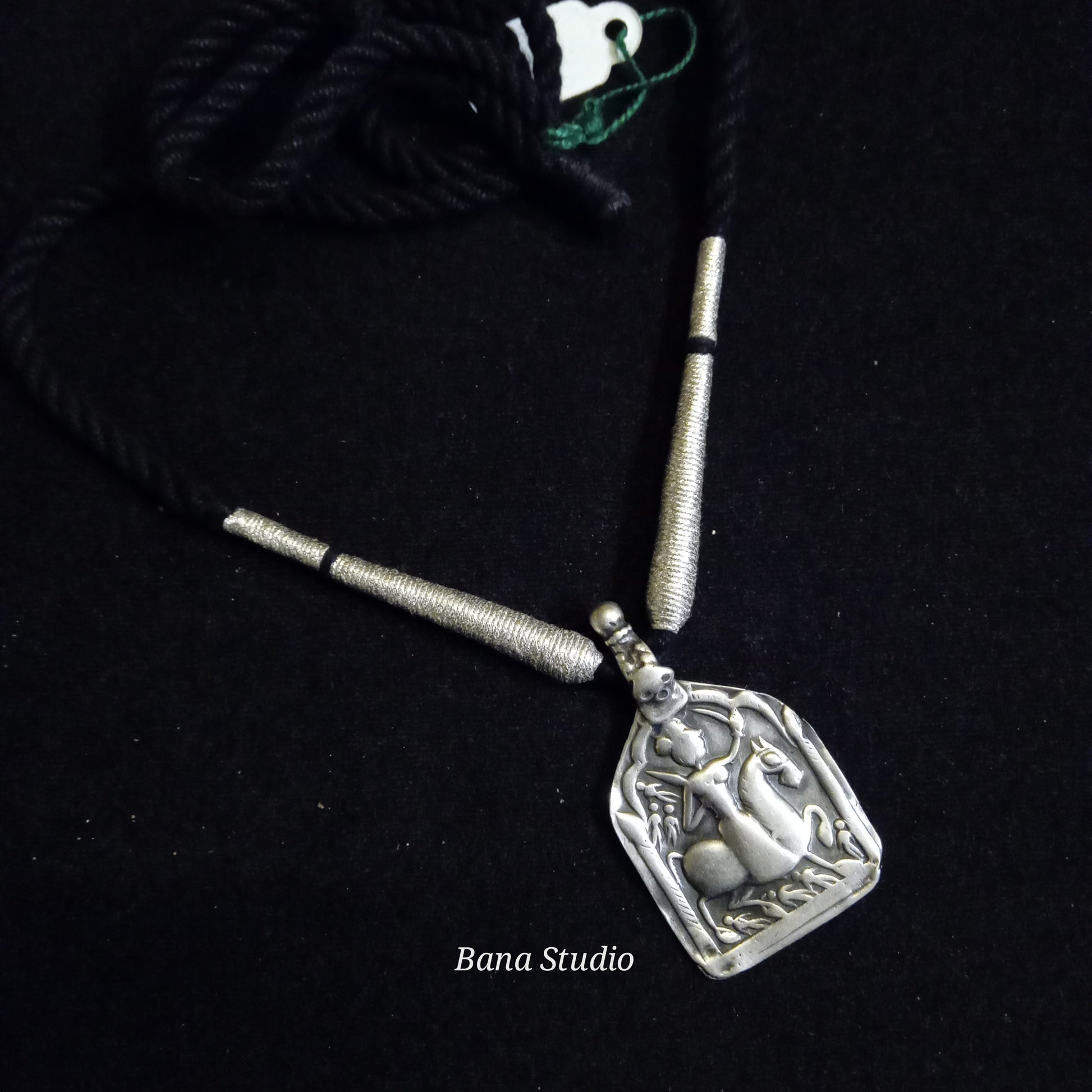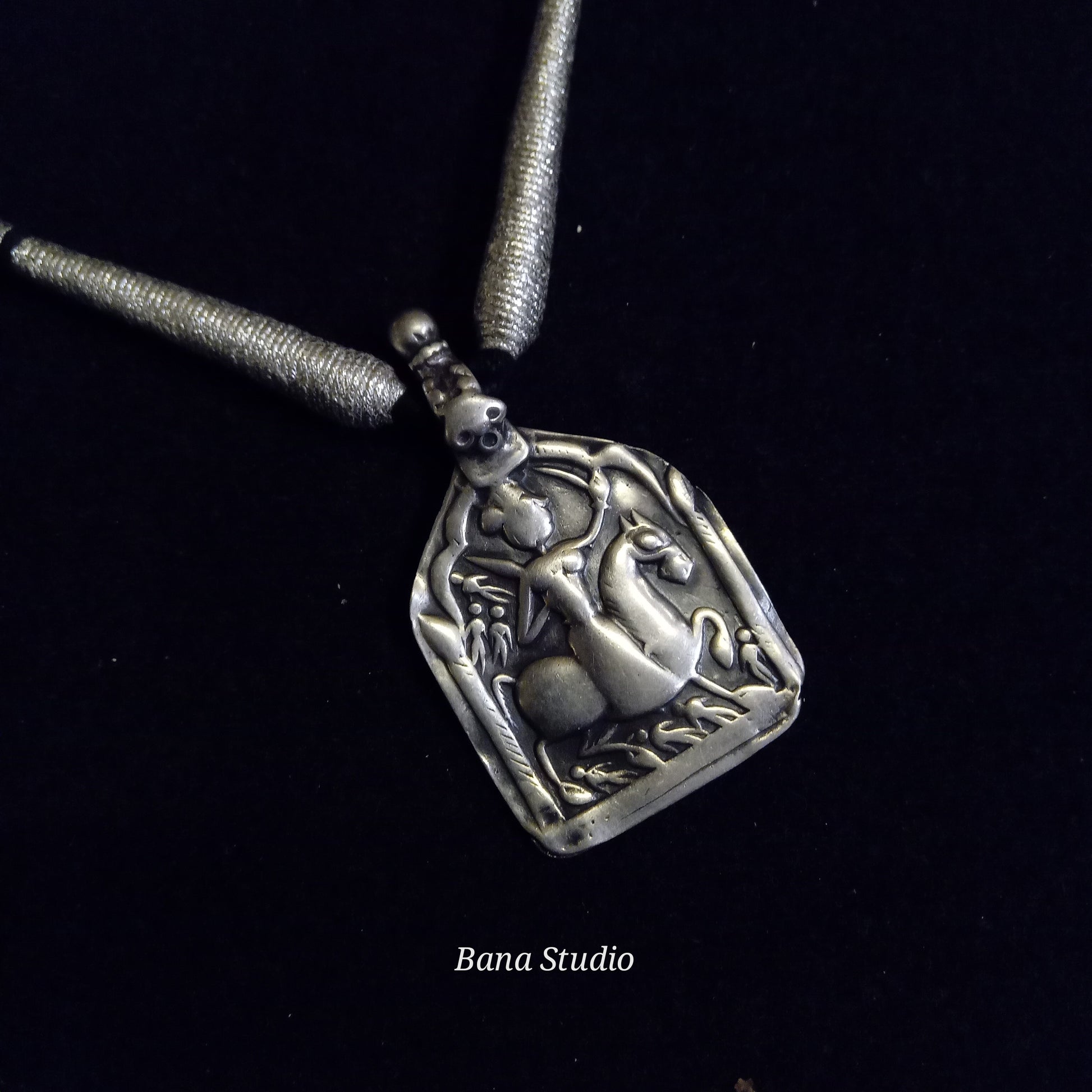 Vintage silver amulet pendant from Rajasthan strung in adjustable cotton thread.