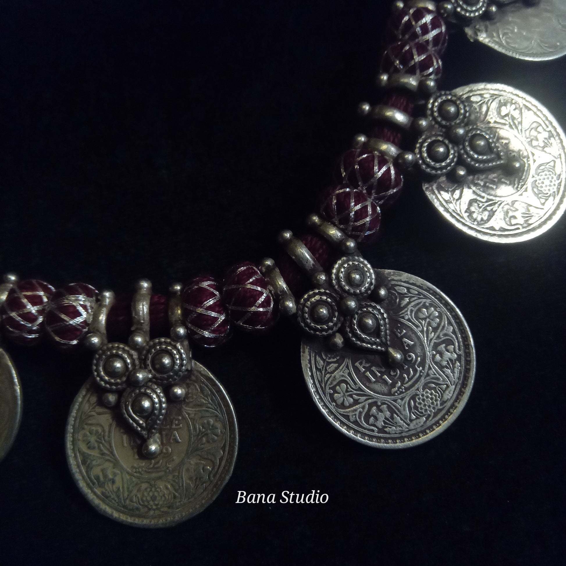 Vintage silver British coins necklace from Rajasthan strung in adjustable cotton thread.