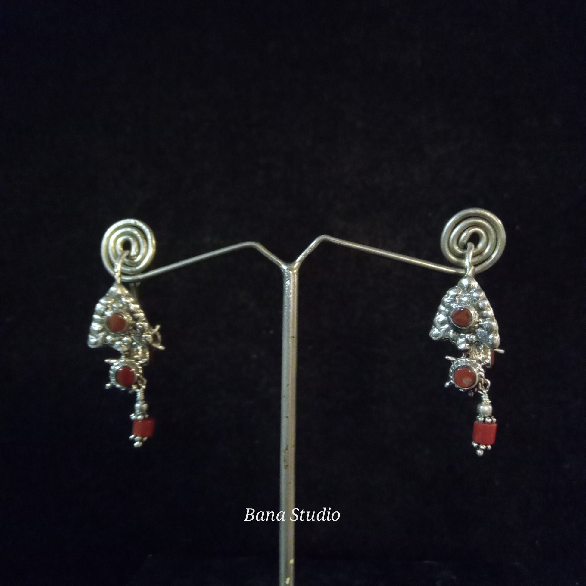 Vintage style 925 silver earrings studded with real natural corals. Length 4cm