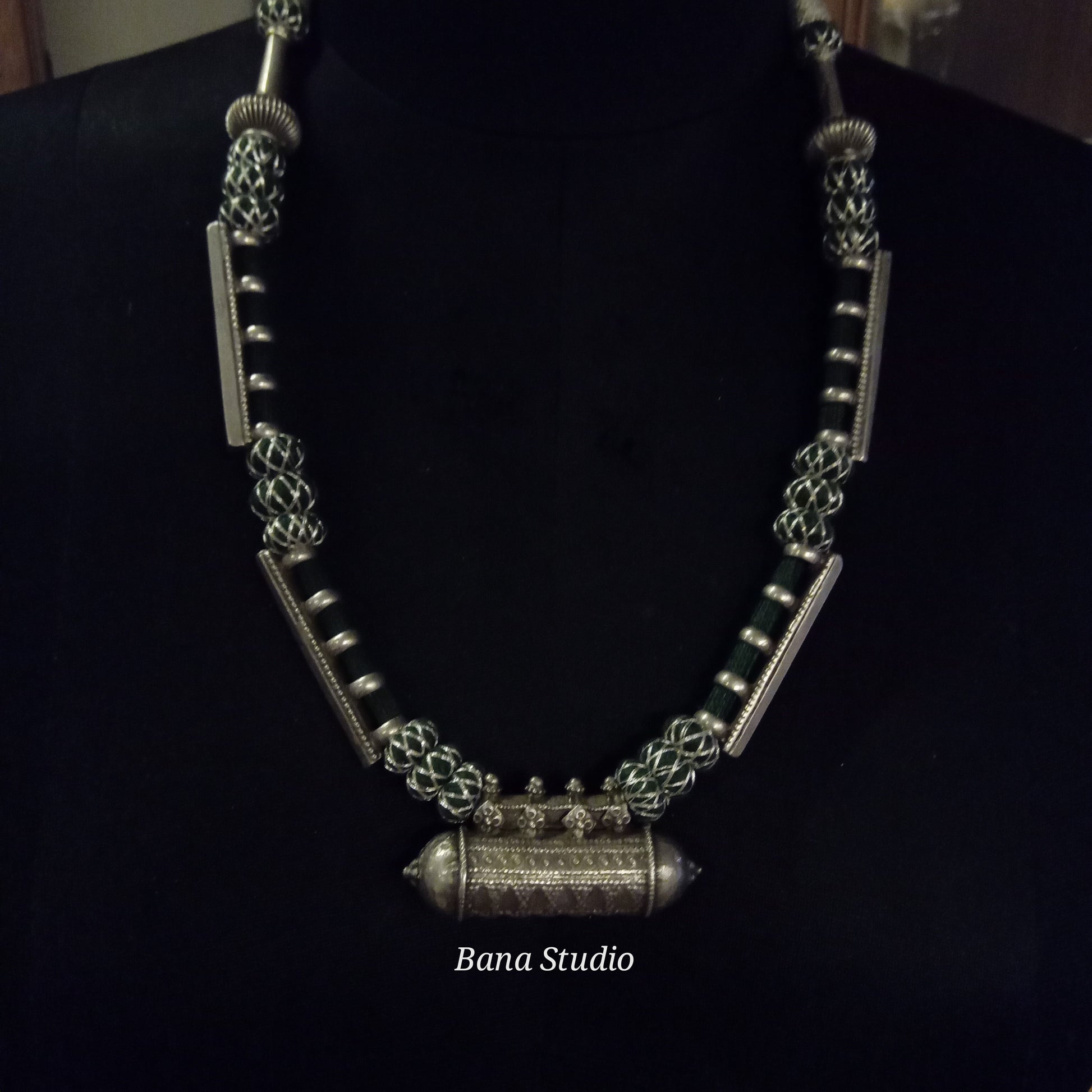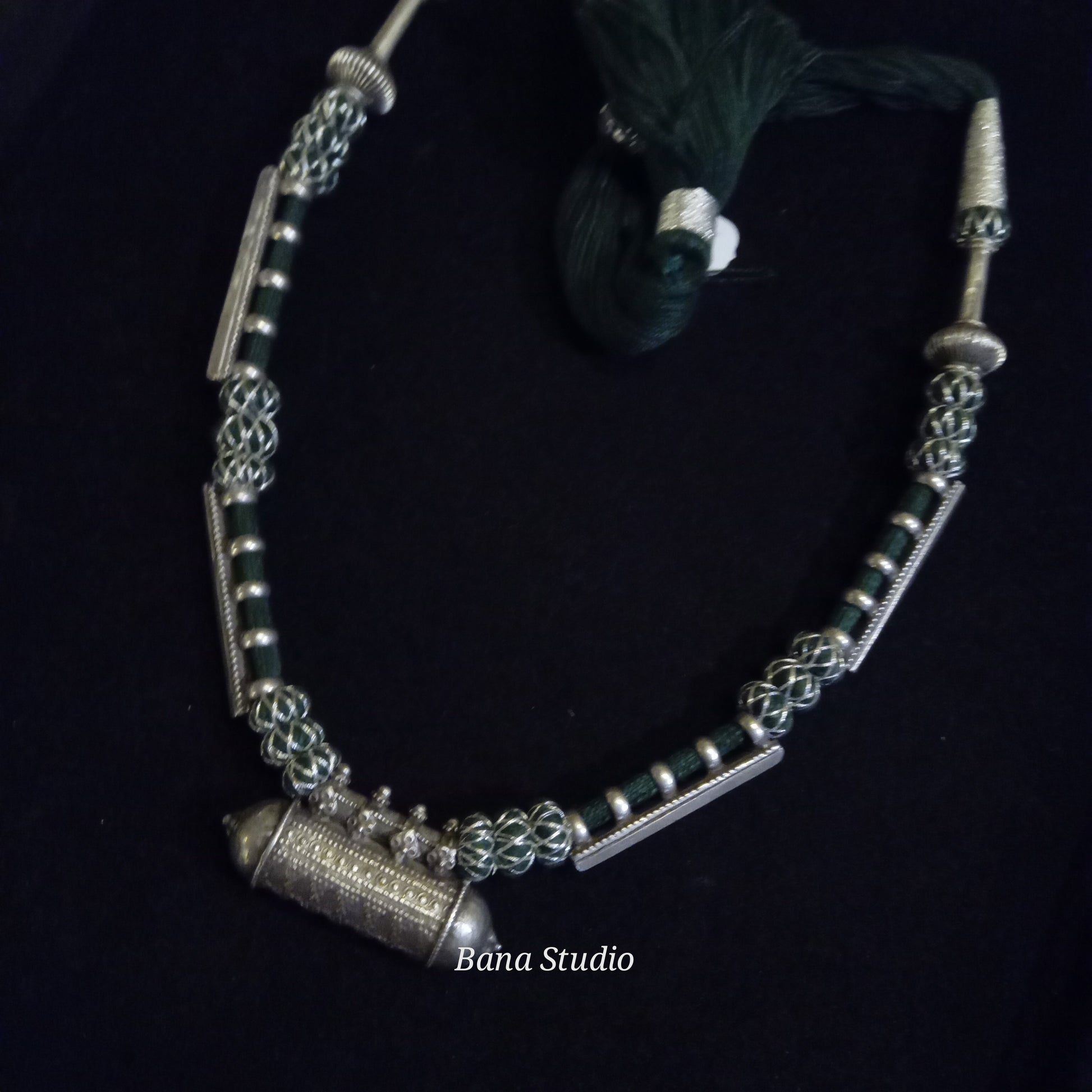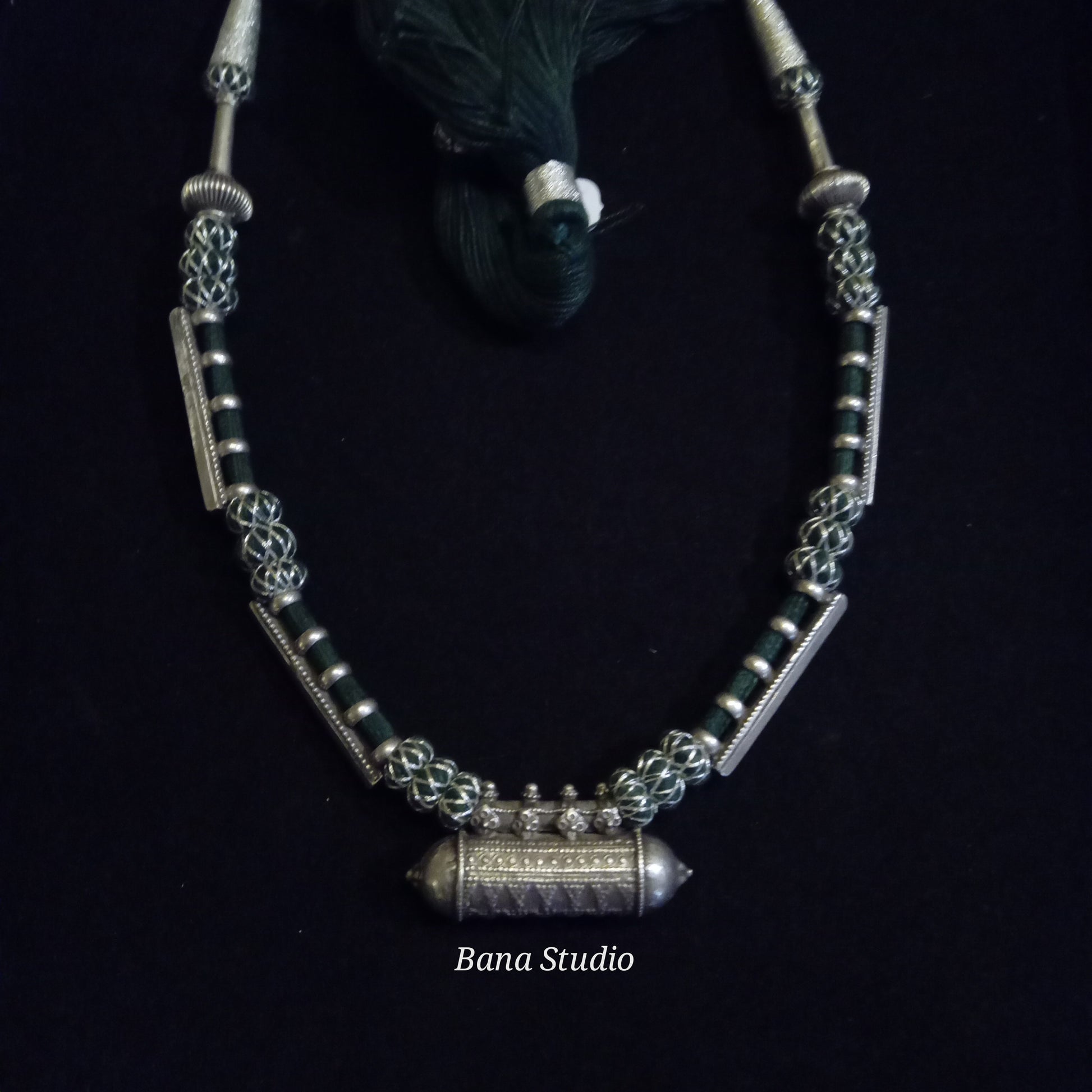 Vintage silver necklace from Rajasthan strung in adjustable cotton thread.
