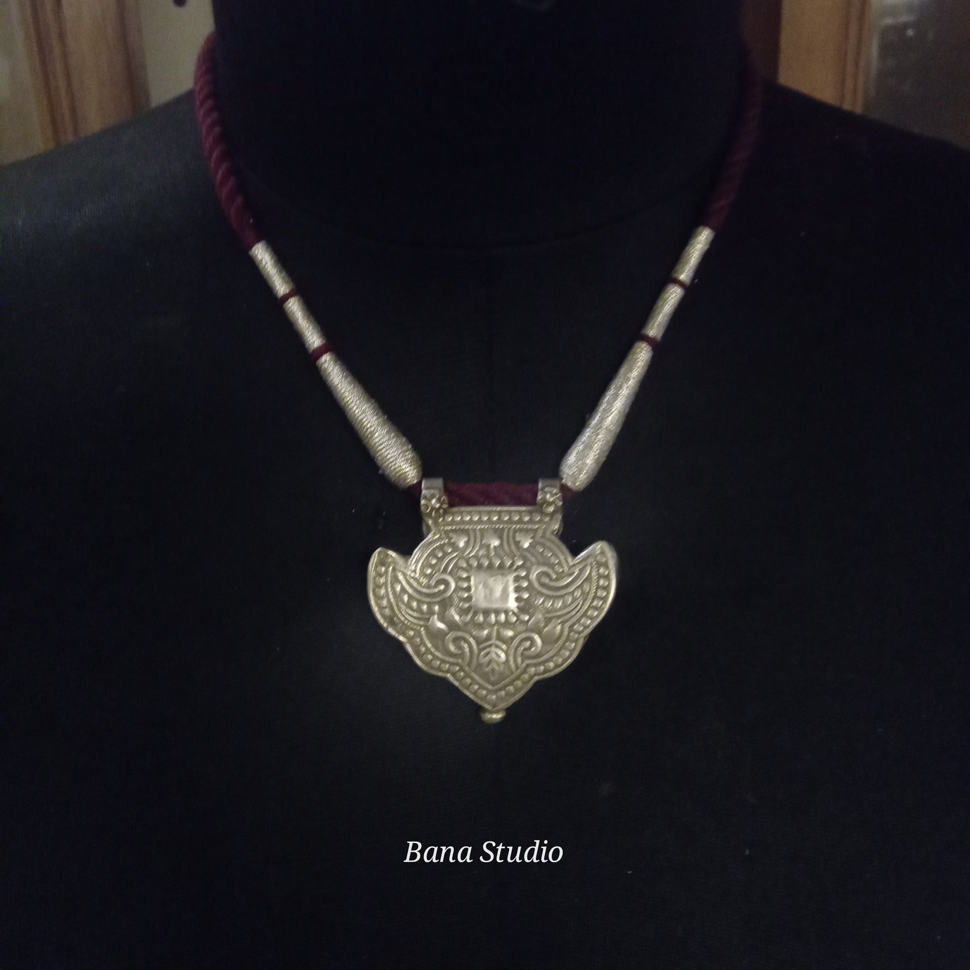 Vintage silver pendant from Madhya pradesh strung in adjustable cotton thread.