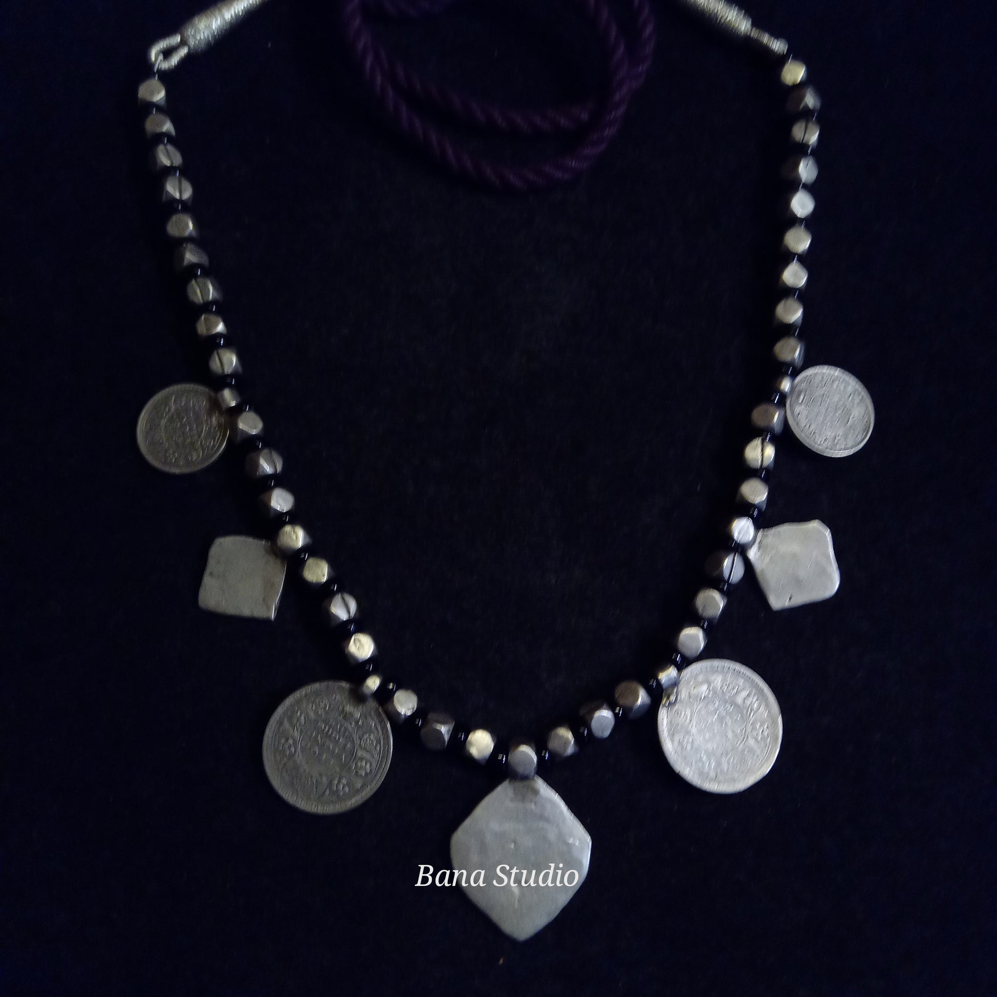 Vintage silver necklace with enamel and British coins from Himachal Pradesh strung in adjustable cotton thread and glass beads.