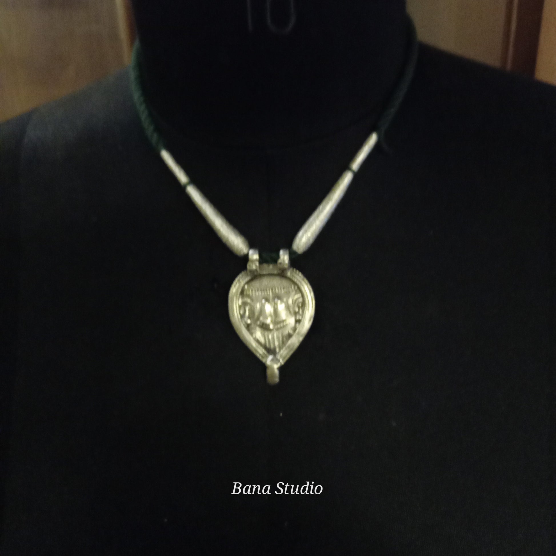 Vintage silver amulet pendant from Rajasthan strung in adjustable cotton thread.